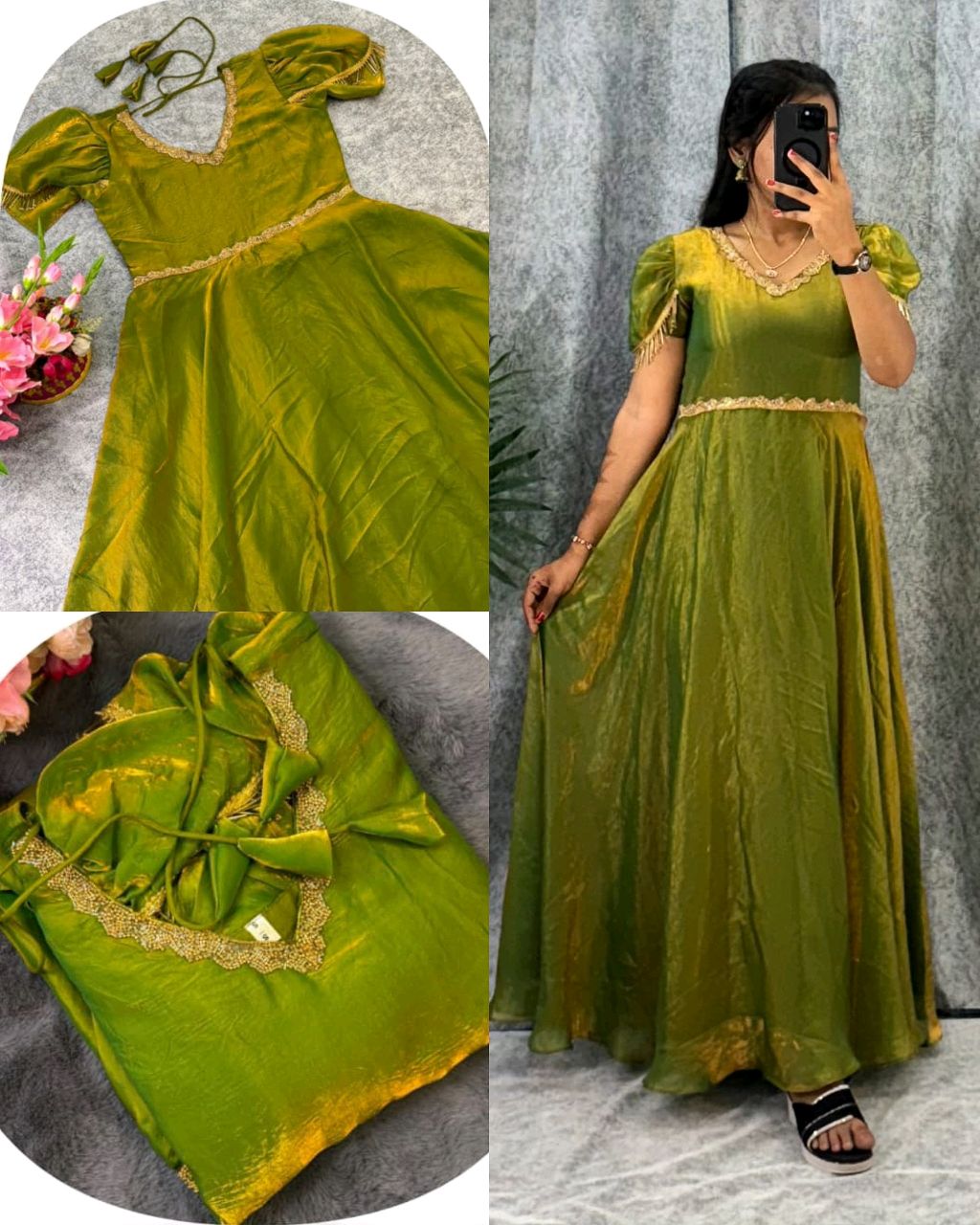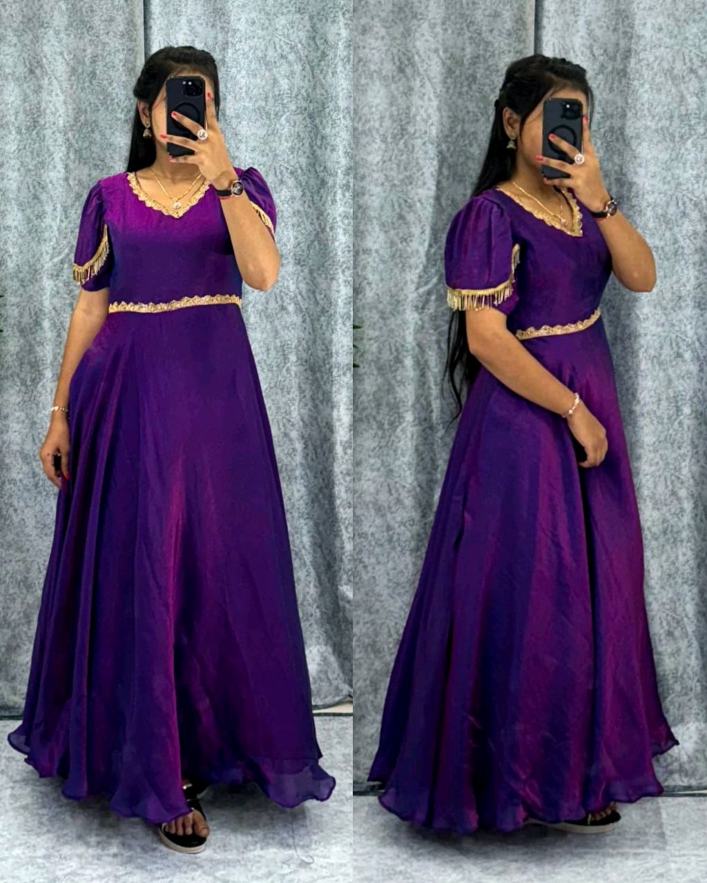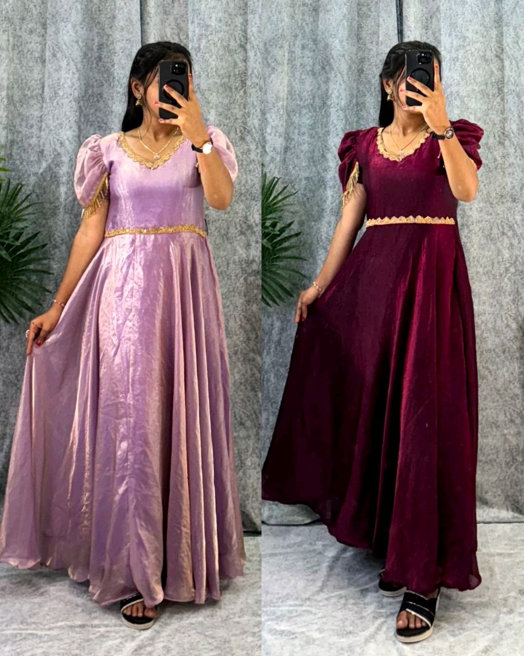 🔸Fabric: space silk (Fandy satin) floor length gown in 4 colours with hotfix lace neck and waist and double sleeves with hanging lace*