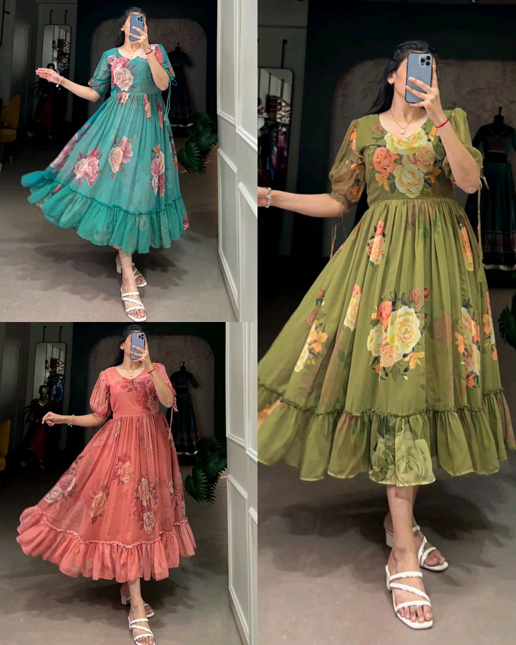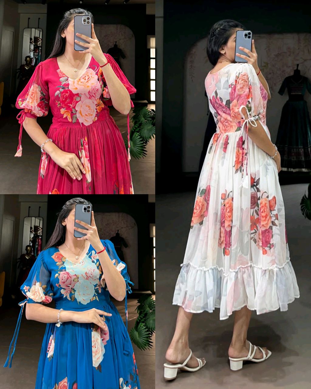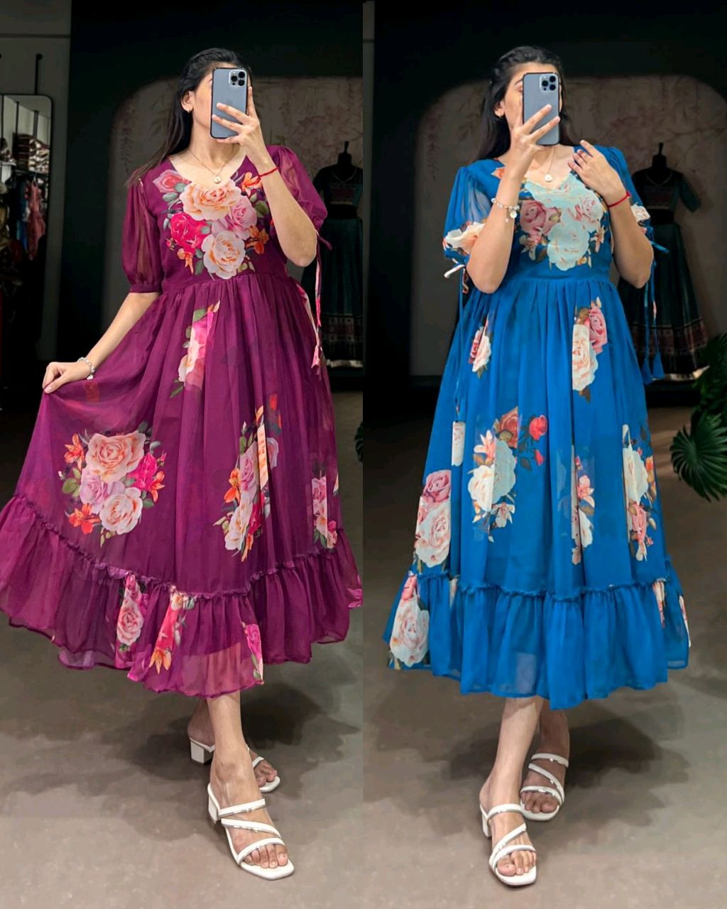 BEAUTIFUL FLORAL MAXI 🌺 🌺 🔸Fabric: Fox Georgette 🔸Complete Linning 🔸Length:- 50″ 🔸Sleeves Short 🔸Flare 5.50 mrts 🔸BUST SIZE : XS – 34, S – 36, M – 38 in, L – 40 in, XL – 42, XXL – 44, XXXL – 46