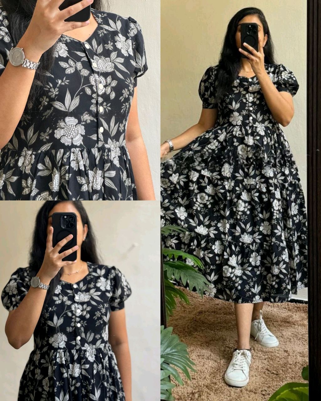 !Beautiful floral print Cotton Full Flair Middy Gown!! 🔸Fabric – Pure Cotton 🔸Length -47 🔸No Puff in hand 🔸SIZE : M(38) L(40) XL(42) XXL (44) 3XL (46)