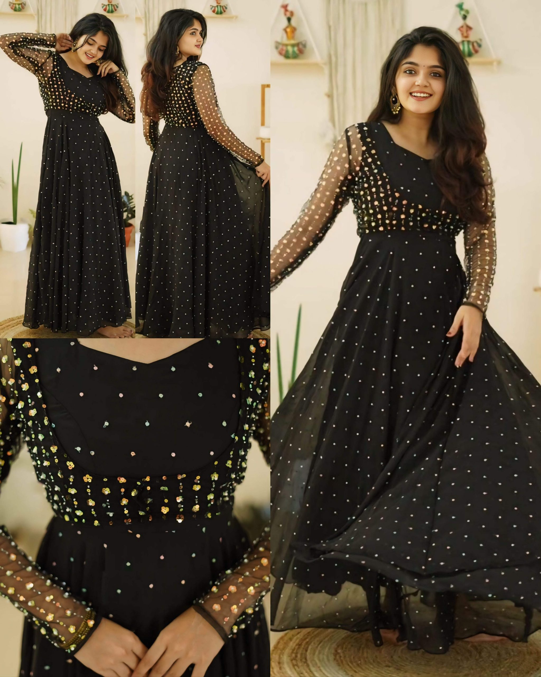 Beautiful New Gown With Coat 🔸Fabric: This set features a Georgette with soft net coat for spacial party wear 🔸Work – Gorgeous multi color sequence work 🔸Length – 52 inch 🔸SIZE : S(36) M(38) L(40) XL(42) XXL (44) 3XL (46)