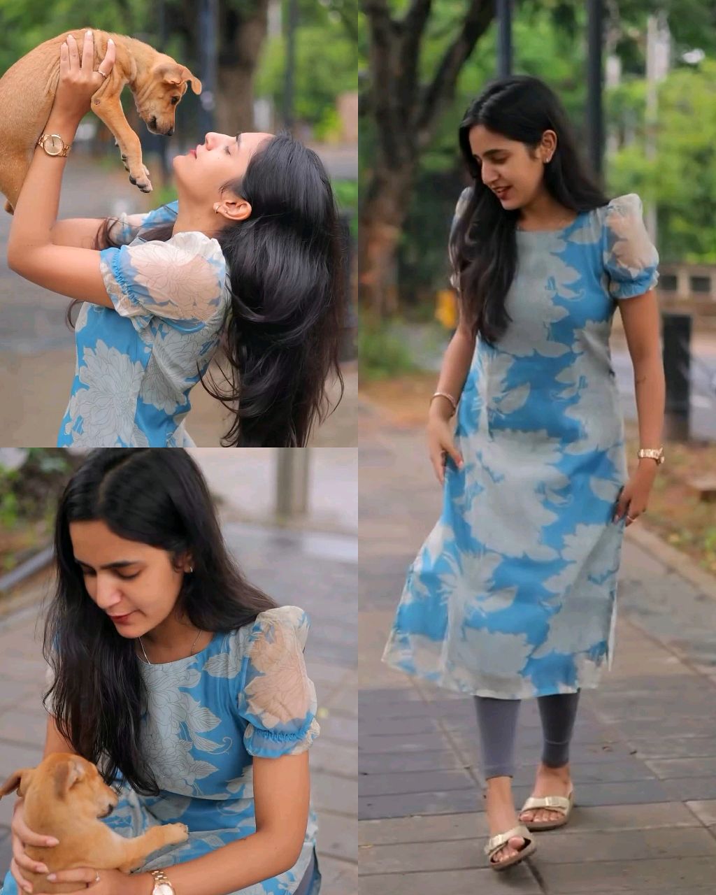 Blue organza Top with puff sleeves 🔸Fabric: Georgette 🔸Sleeve Length: Three-Quarter Sleeves 🔸Pattern: Printed 🔸Combo of: Single 🔸SIZE : XS (34) S(36) M(38) L(40) XL(42) XXL (44)