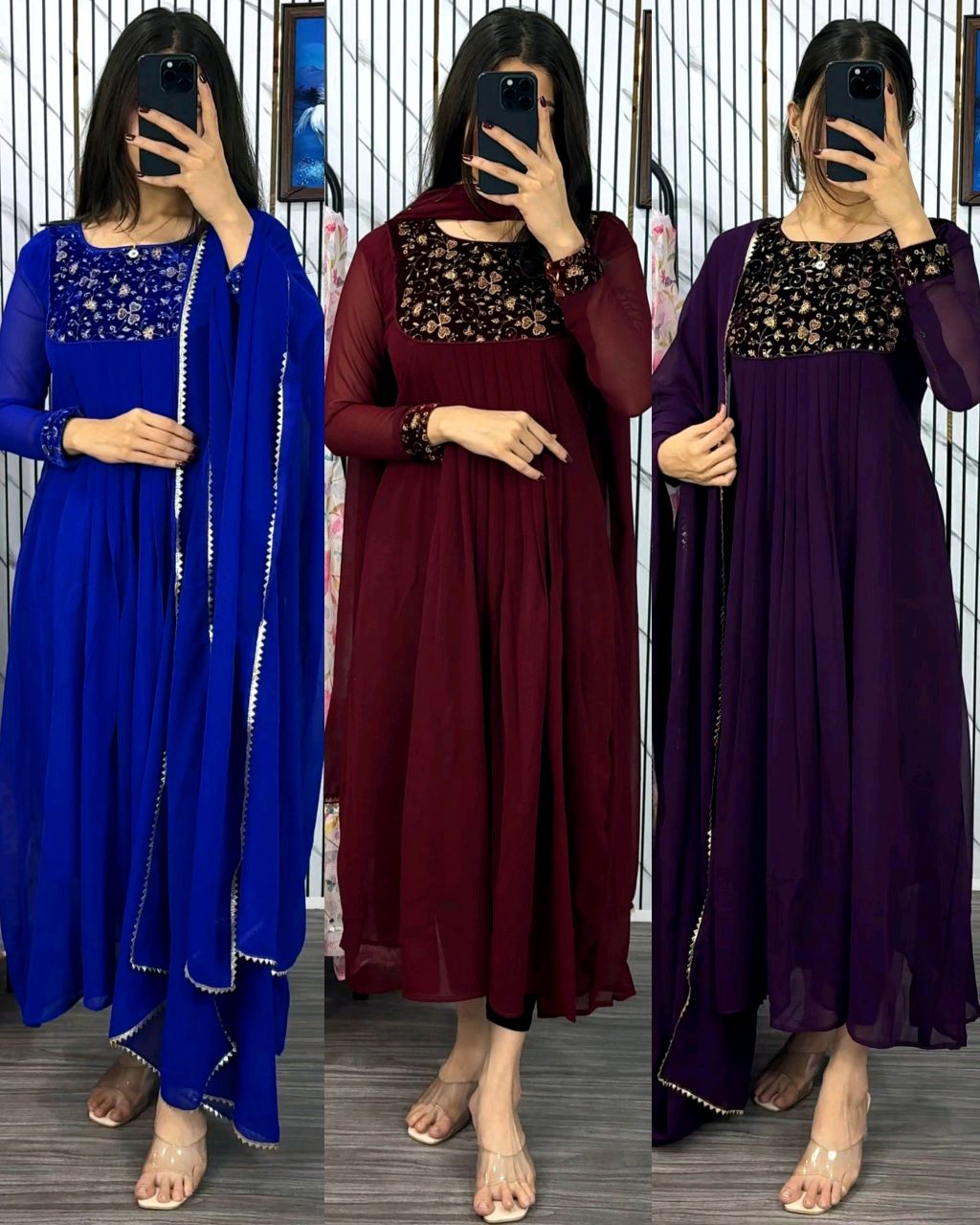 Elegance Look Beautiful Outfits 🔸FABRIC : georgette with velvet yok work. 🔸linning :butter crepe 🔸length : 49-50 inches. 🔸Dupatta georgette with samosa lace. 🔸length :2.10 mtr. 🔸BUST SIZE : XS – 34, S – 36, M – 38 in, L – 40 in, XL – 42, XXL – 44, XXXL – 46