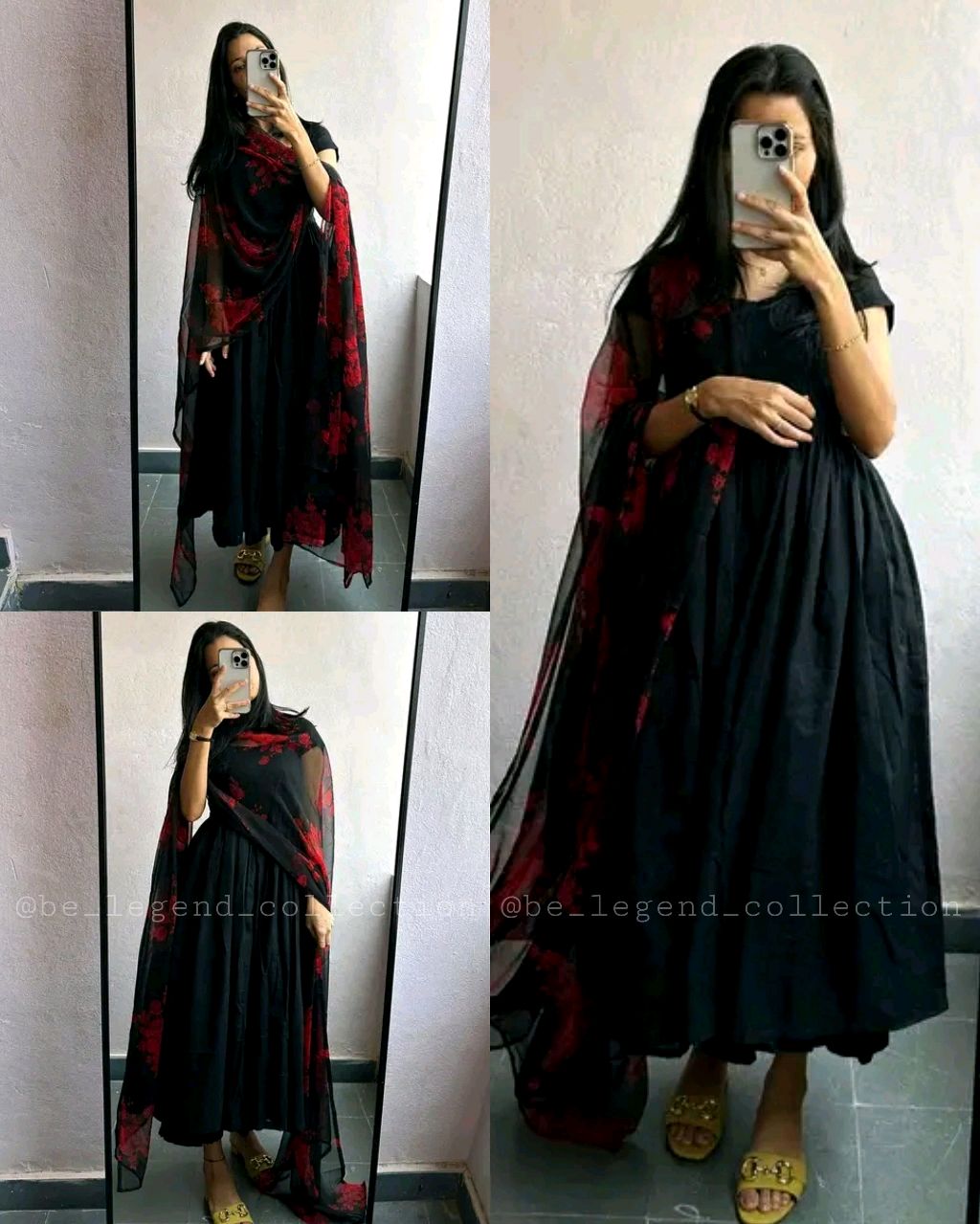 Elegant and Stylish Black Flared Kurta With Dupatta 🔸Fabric: Georgette 🔸Sleeve Length: Short Sleeves 🔸Set Type: Kurta with Dupatta 🔸Stitch Type: Stitched 🔸BUST SIZE : S – 36, M – 38 in, L – 40 in, XL – 42, XXL – 44