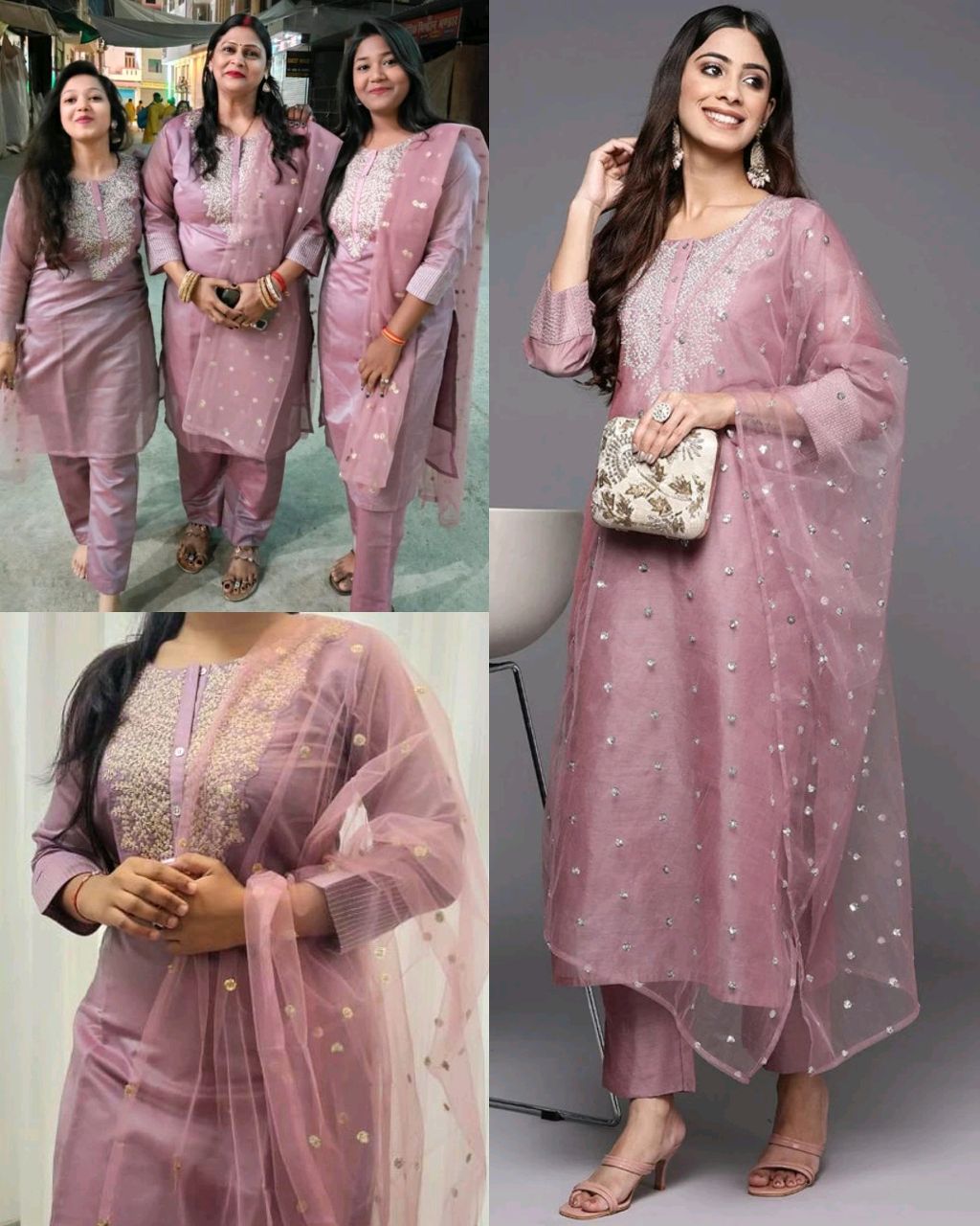 Elegant Mauve Pink Women’s Ethnic 3-Piece Set with Embroidered Kurti, Elastic Pant & Sequined Net Dupatta coding work kurti with pant set