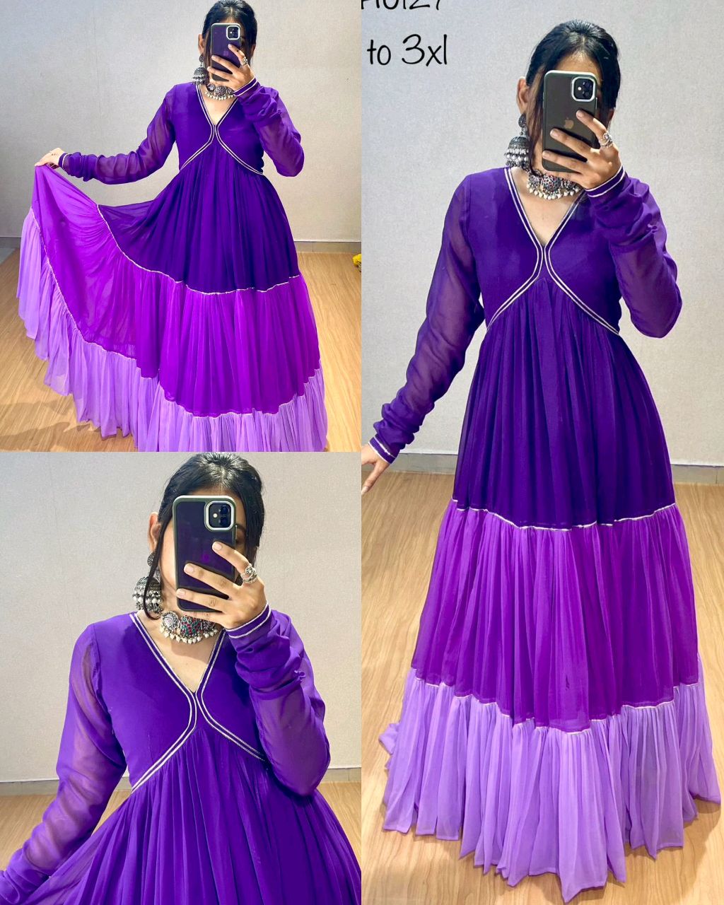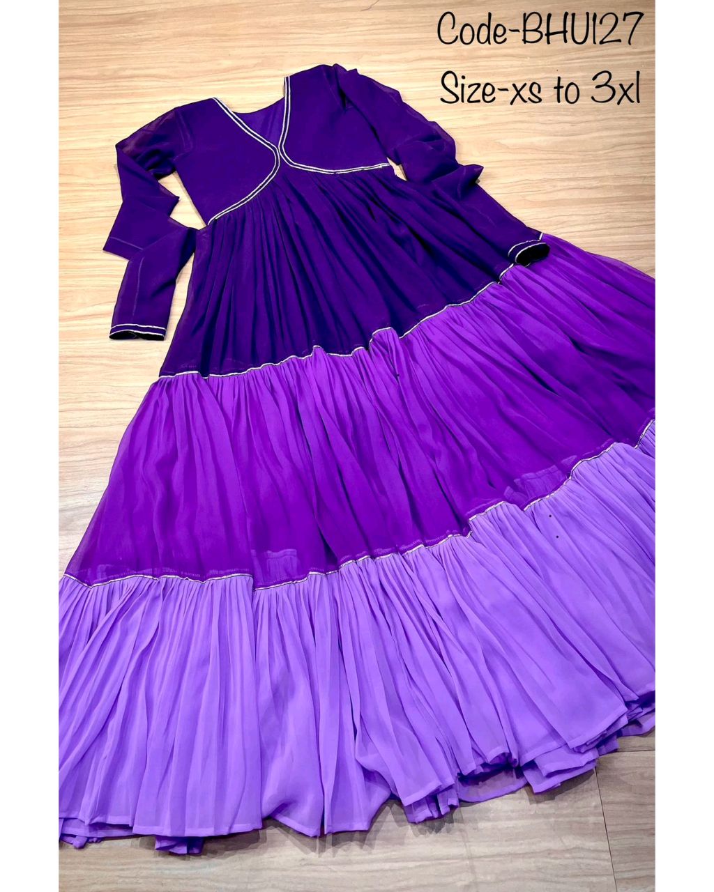 Elevate your ethnic fashion with our violet flared anarkali, with beautiful gota patti work and beautiful three color shades.