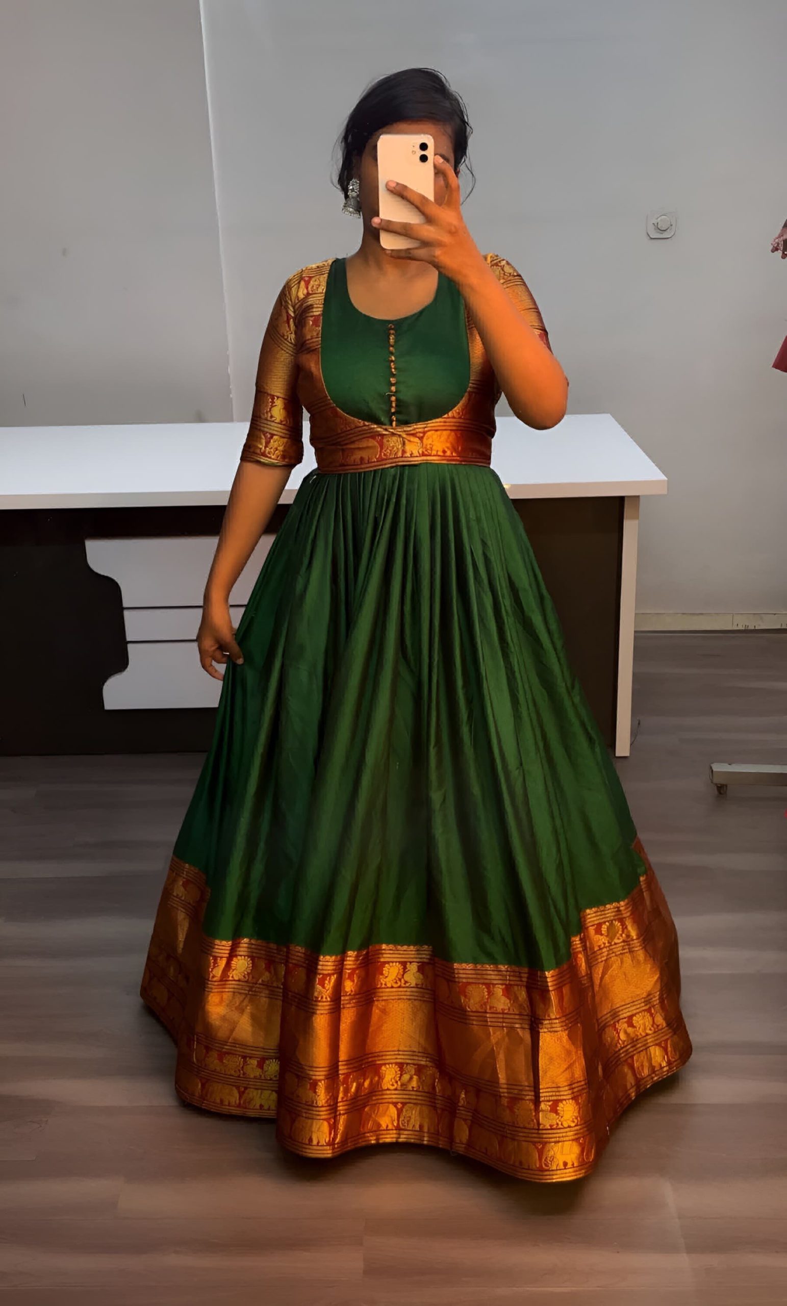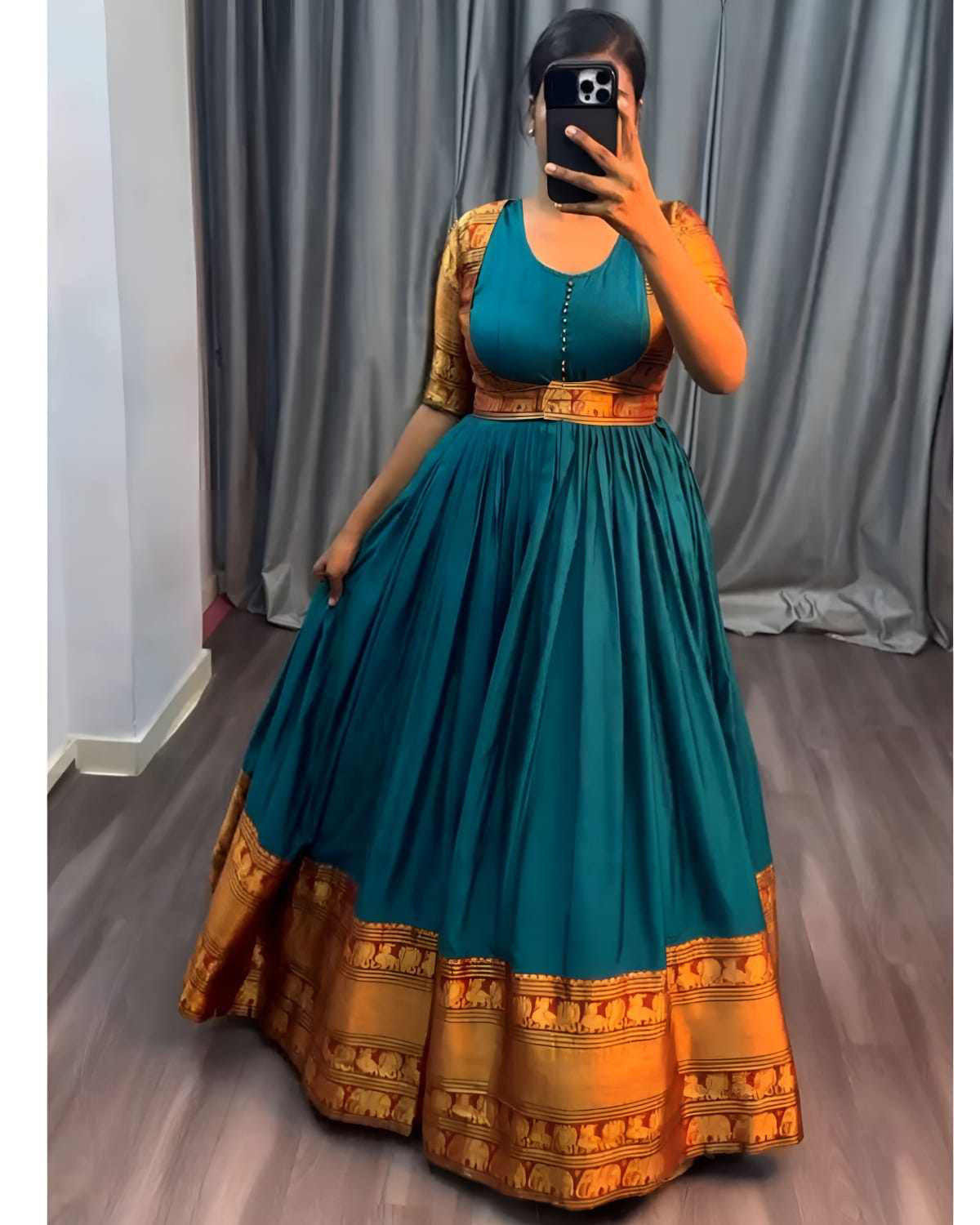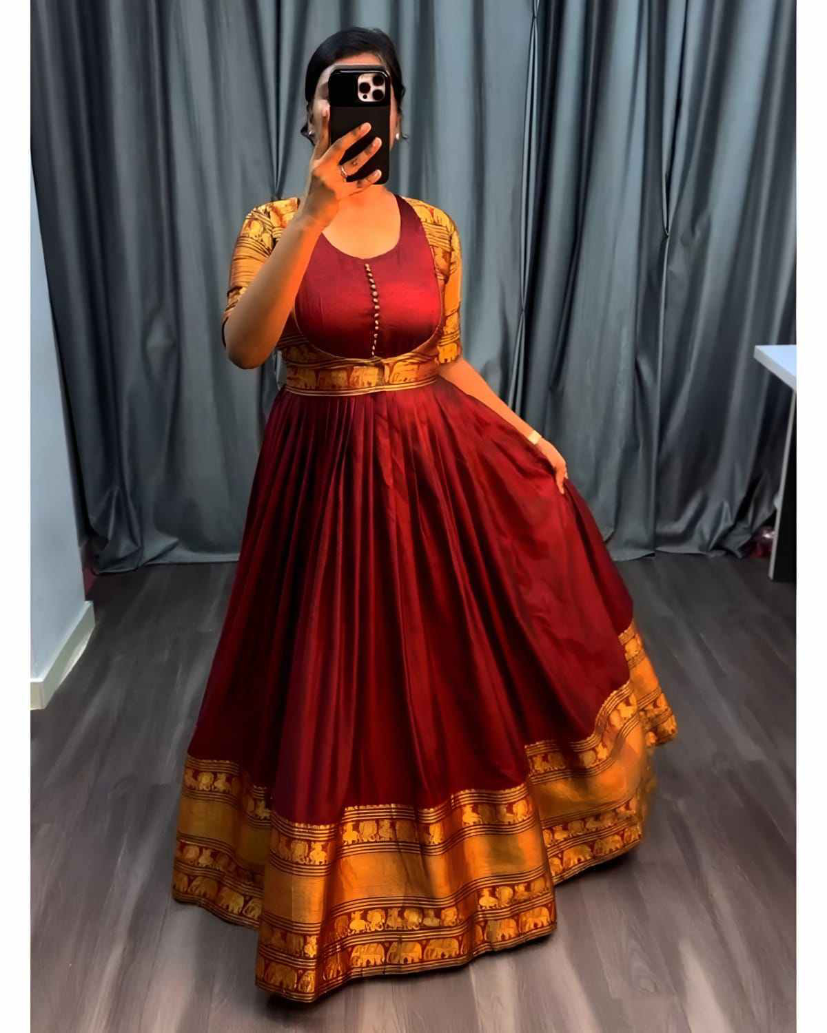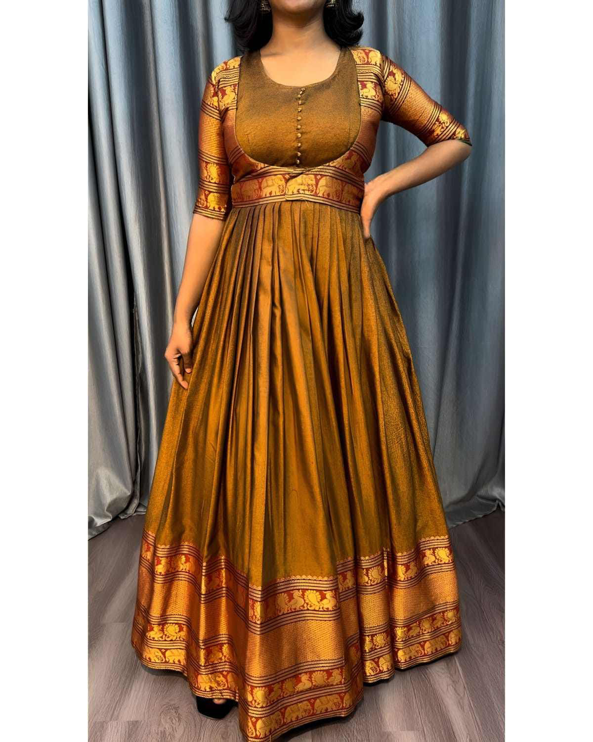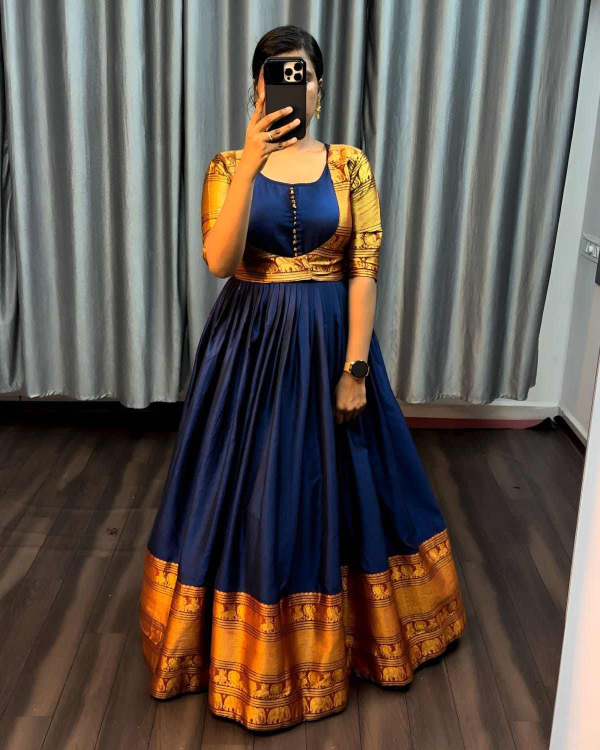 Gown with Removable coat 🔸Fabric : Pure Narayanpet 🔸SIZE : S(36) M(38) L(40) XL(42) XXL (44) 🔸Flare : 3 meter heavy flare 🔸Full crepe lining 🔸Length : 54-55 inches