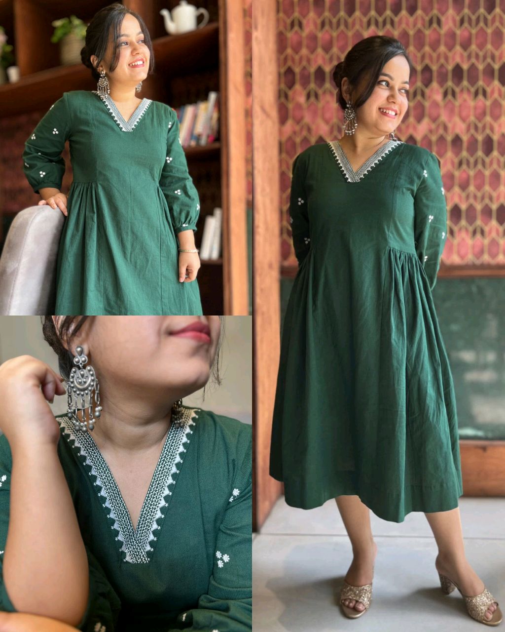 Green Embrodered Dress 🔸Fabric: Rayon 🔸Sleeve Length: Three-Quarter Sleeves 🔸Pattern: Solid 🔸BUST SIZE : M – 38 in, L – 40 in, XL – 42, XXL – 44
