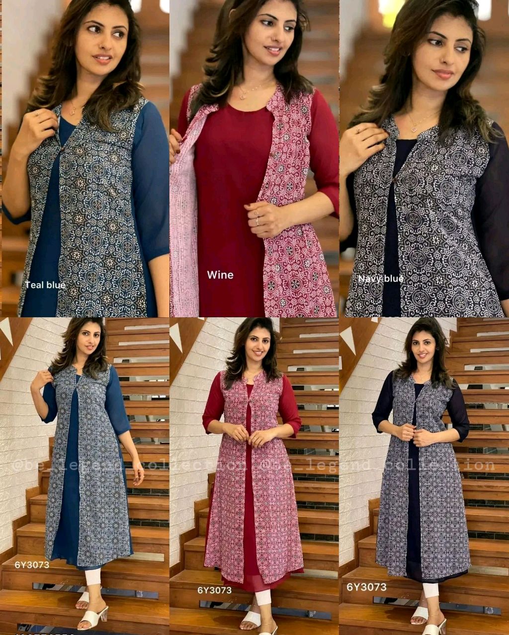 Jacket style Kurti 🔸Fabric: Heavy georgette Febric jacket with full Kurtis with batton 🔸BUST SIZE : M – 38 in, L – 40 in, XL – 42, XXL – 44