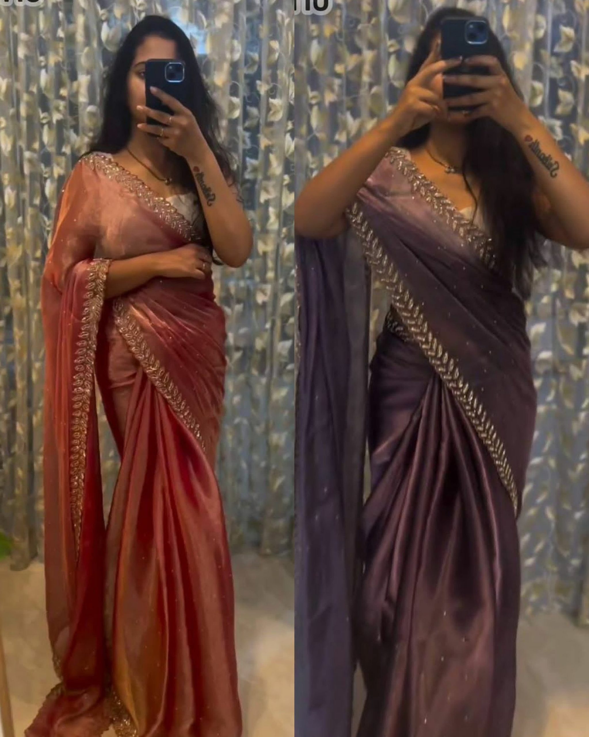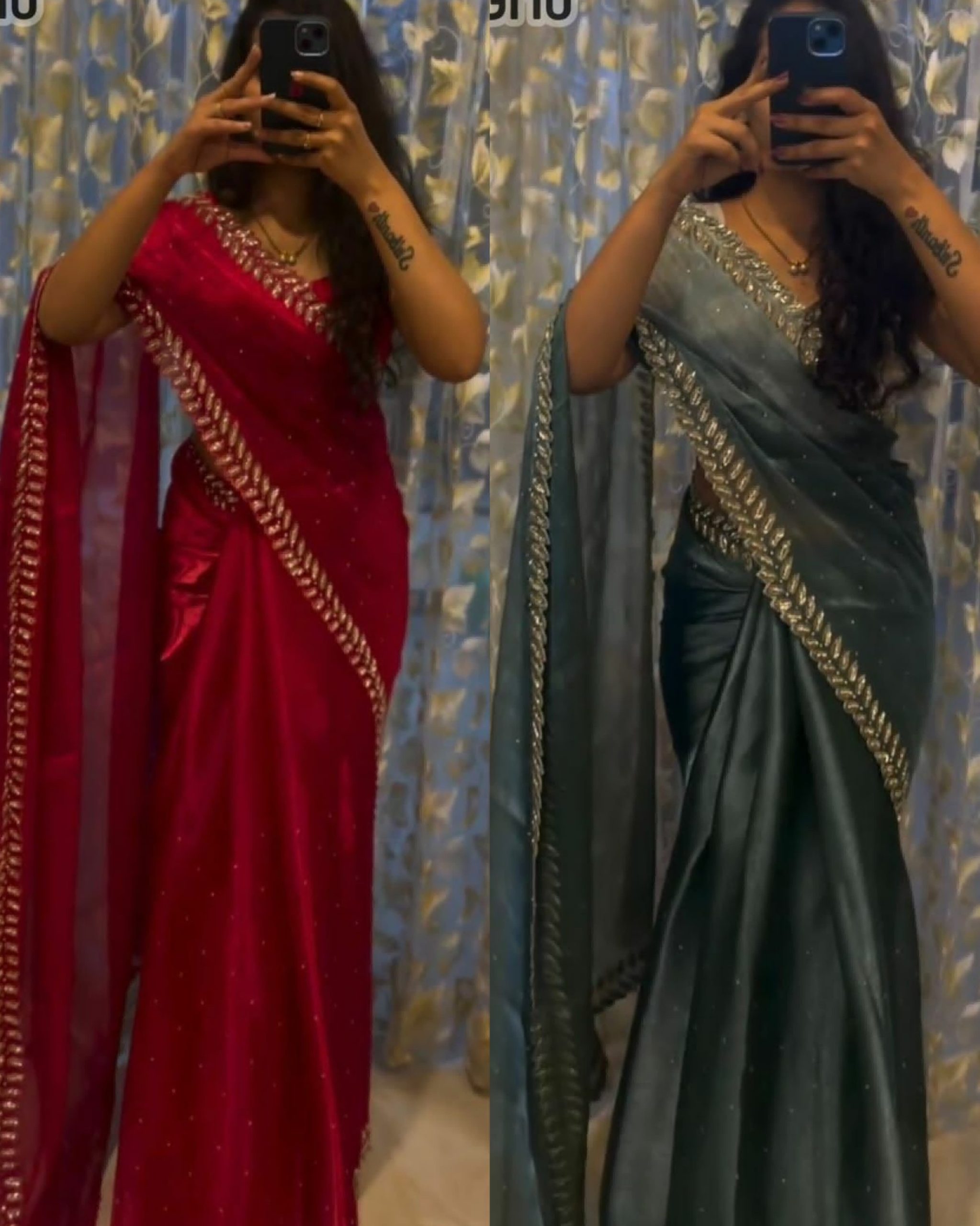 Sold out all🚫 Jimmy Choo Saree 5 Colours 🔸Saree Fabric: Fabric :-Jimmy choo 🔸Work :-Thred & Sequnce With 🔸Diamond work. 🔸Cut :-5.5 🔸Weight :-0.700 Grm 🔸Blouse Fabric. :-Mono Benglori Silk 🔸Free Size (Saree Length Size: 5.5 m, Blouse Length Size: 1.0 m)