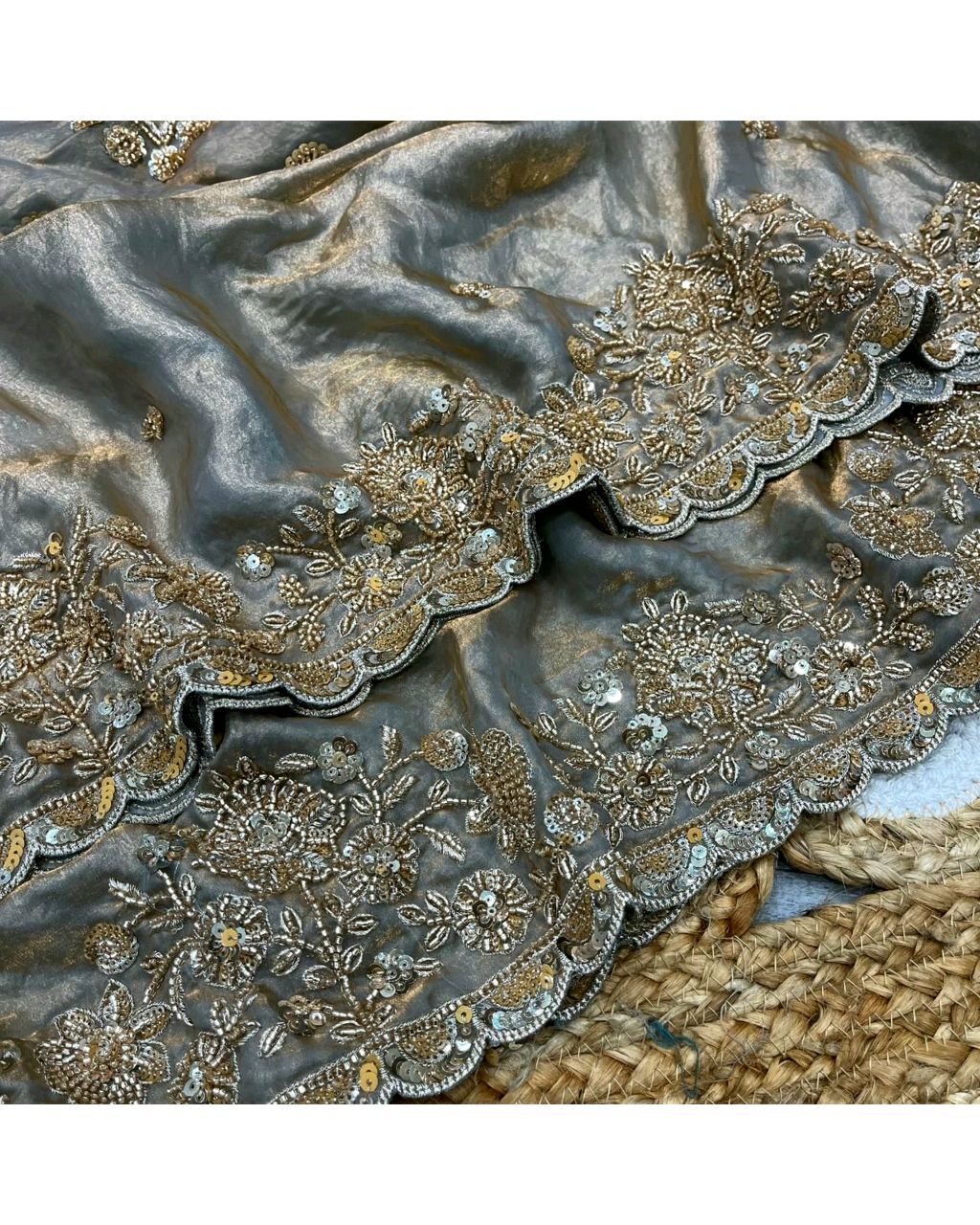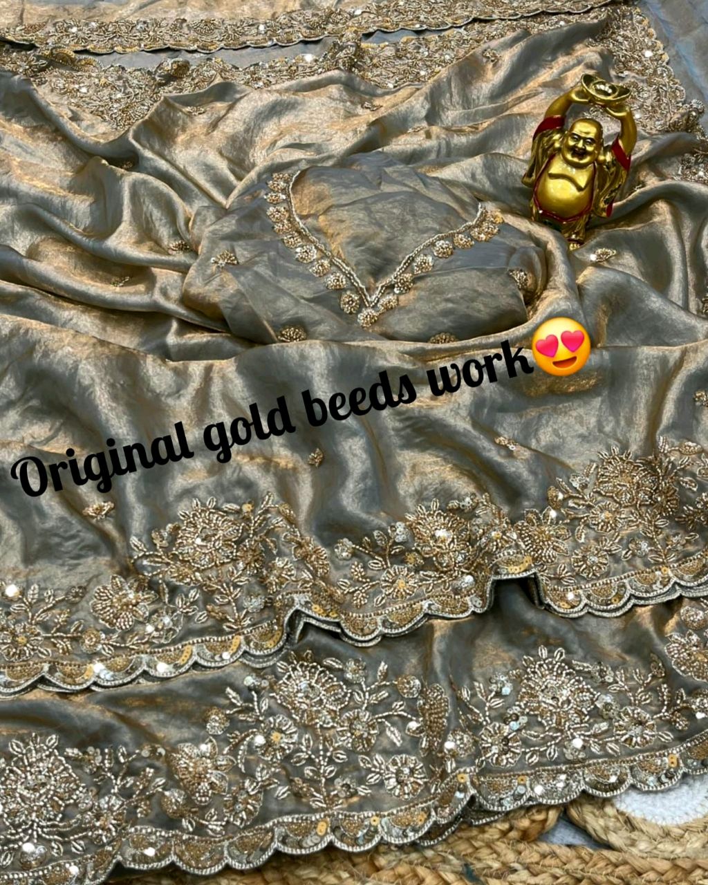 Launch Grand party wear saree in original gold beeds work 🔸Fabric: On pure space silk sarees in velvet shine adorned with sequence and cutdana delicate handwork 🔸With work blouse piece
