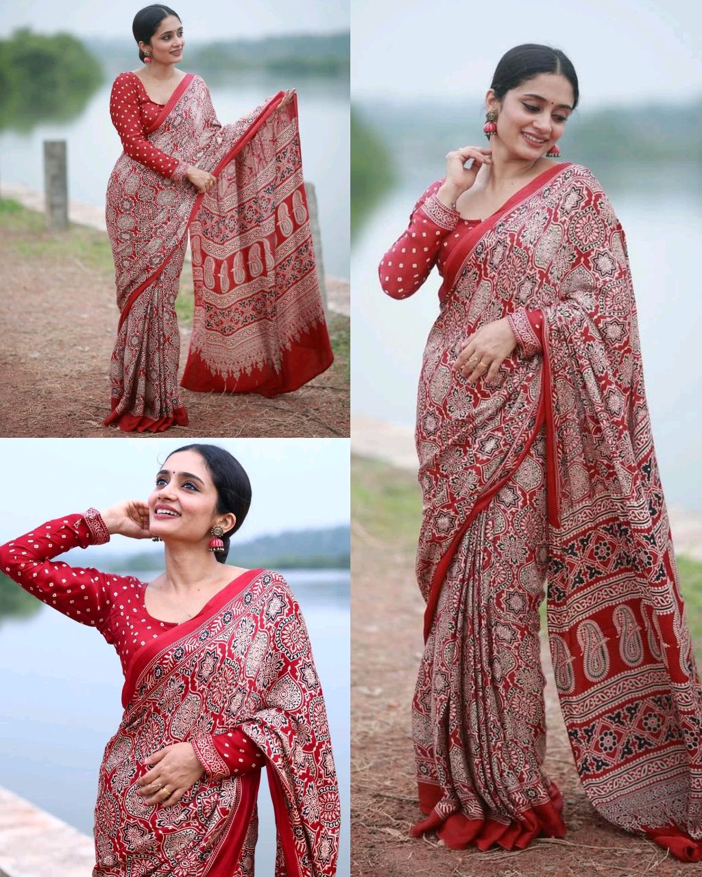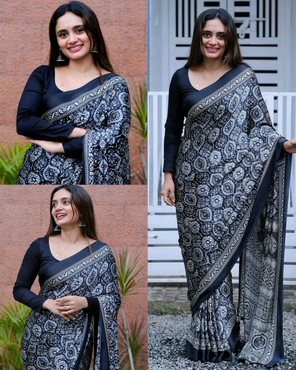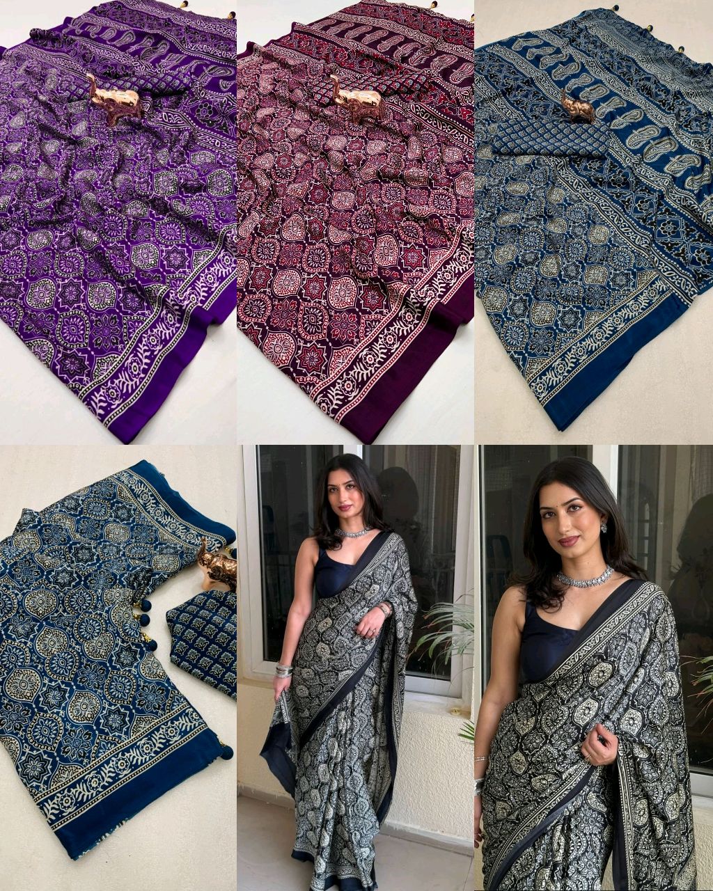 Launching New Modal Satin Crape Trending Saree 🔸 Fabric : Pure Satin with Ajrak printed Sarees rich Pallu with heavy tussles 🔸BLOUSE :- RUNNING BLOUSE WITH SAREE 🔸Free Size (Saree Length Size: 5.5 m, Blouse Length Size: 1.0)