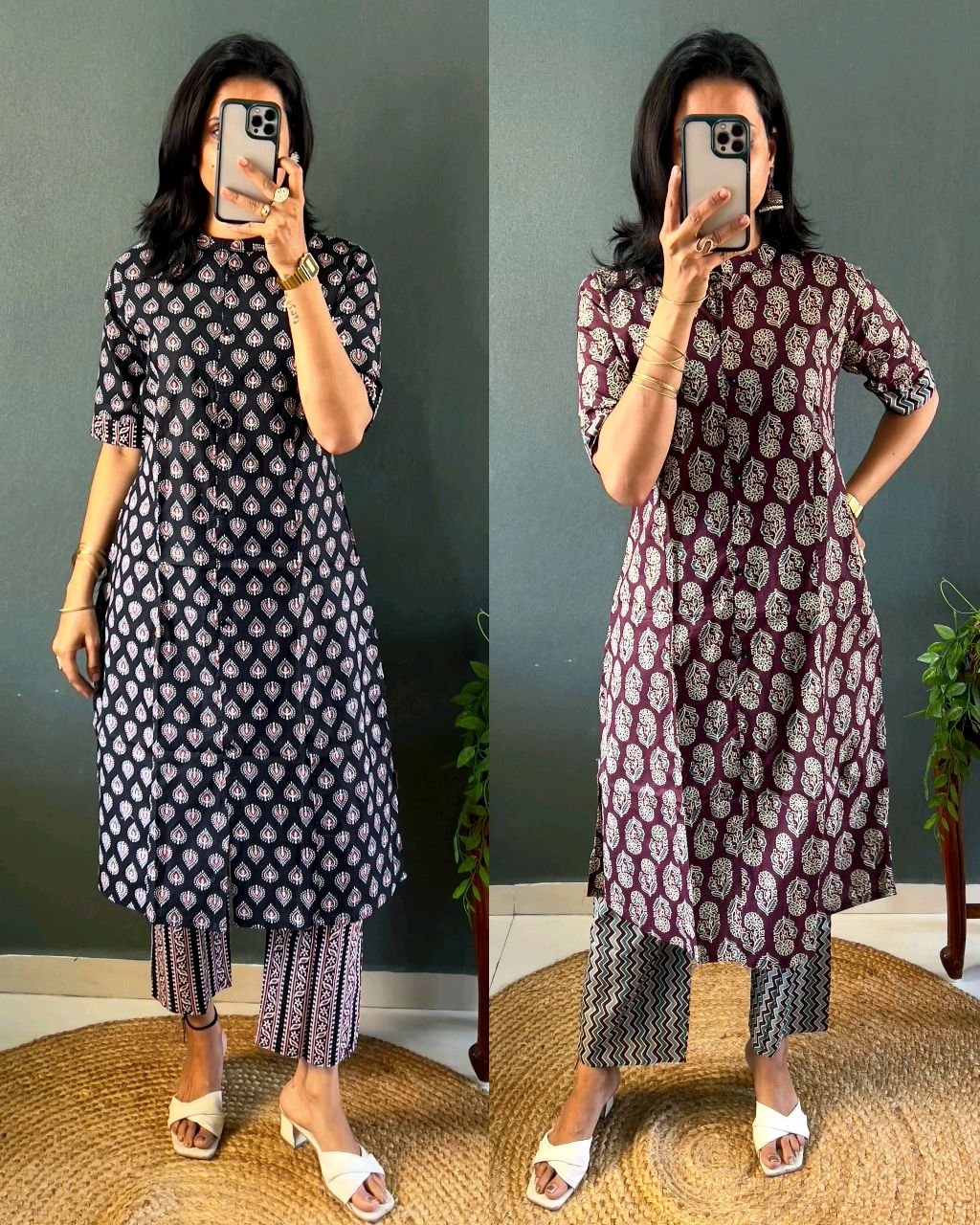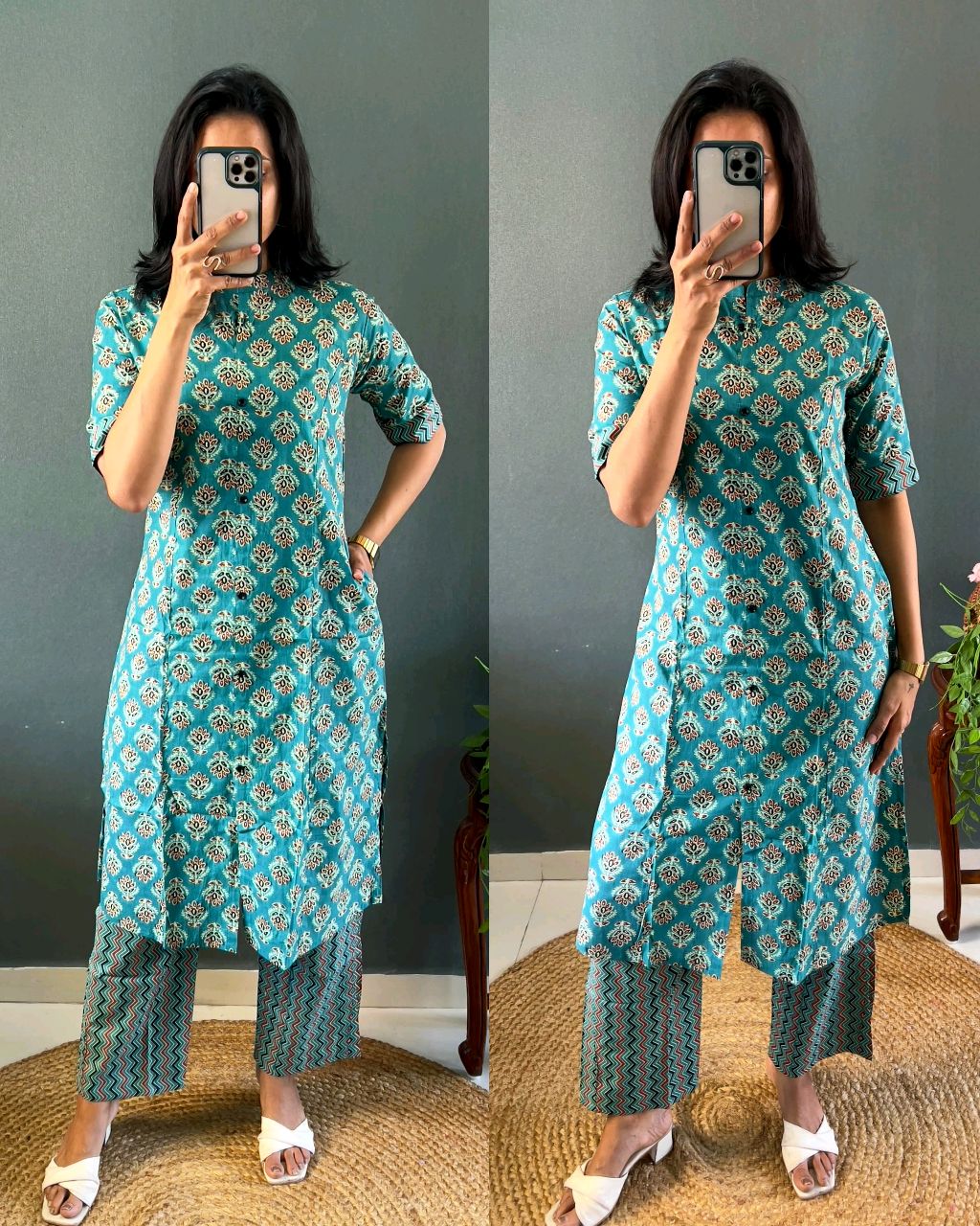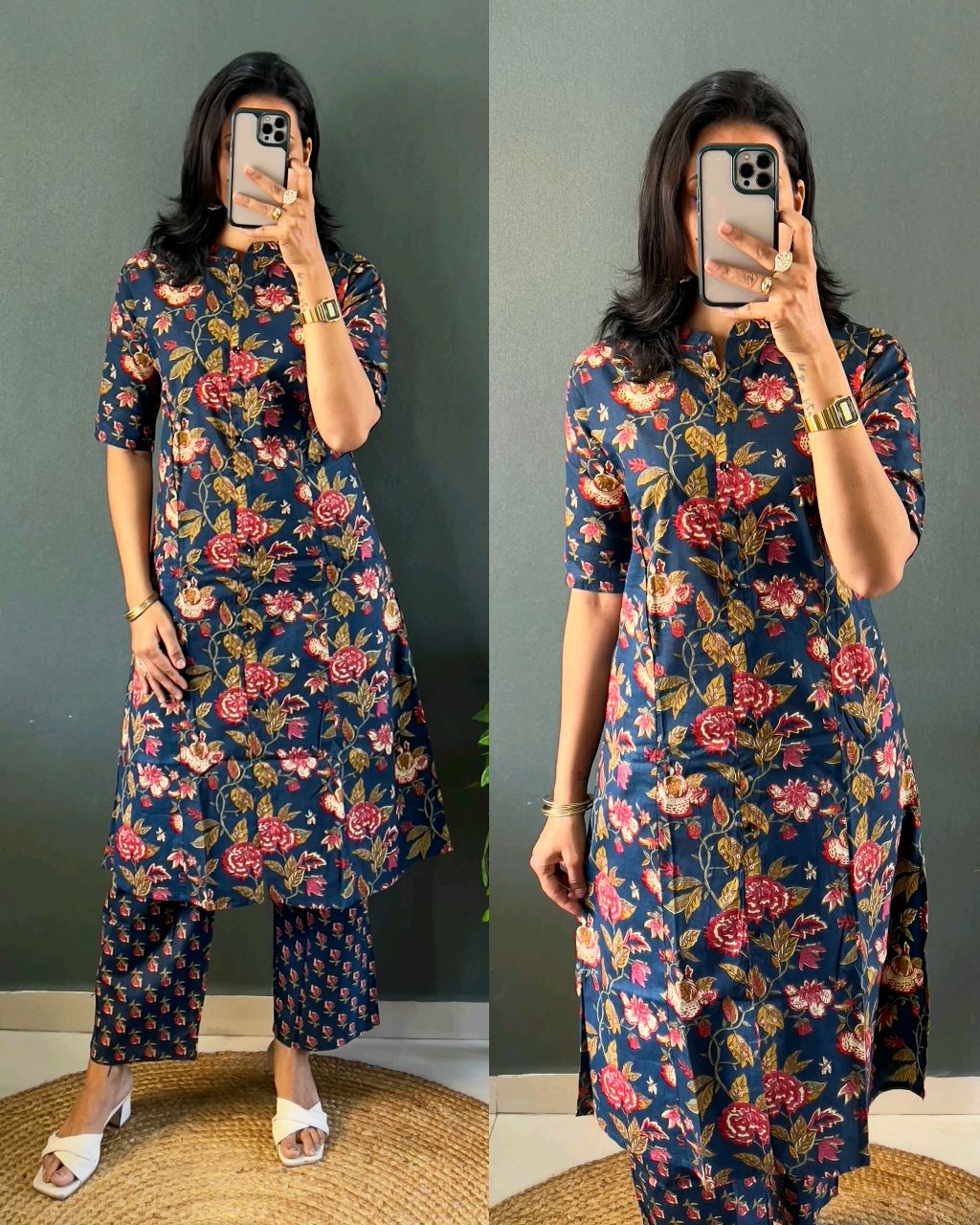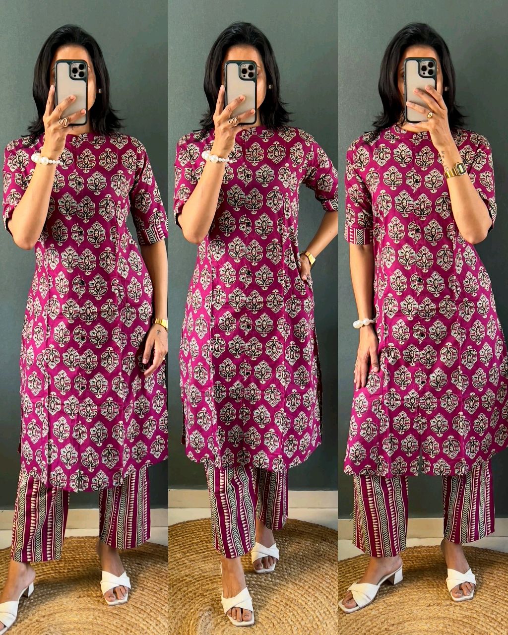 Sold out all size🚫 Launching pure jaipuri 100%Cotton Co-Ords set 🔸Fabric : Cotton 🔸Kurti Length 44 Approx 🔸Pant length 37 Approx 🔸One side pocket 🔸BUST SIZE : M – 38 in, L – 40 in, XL – 42, XXL – 44