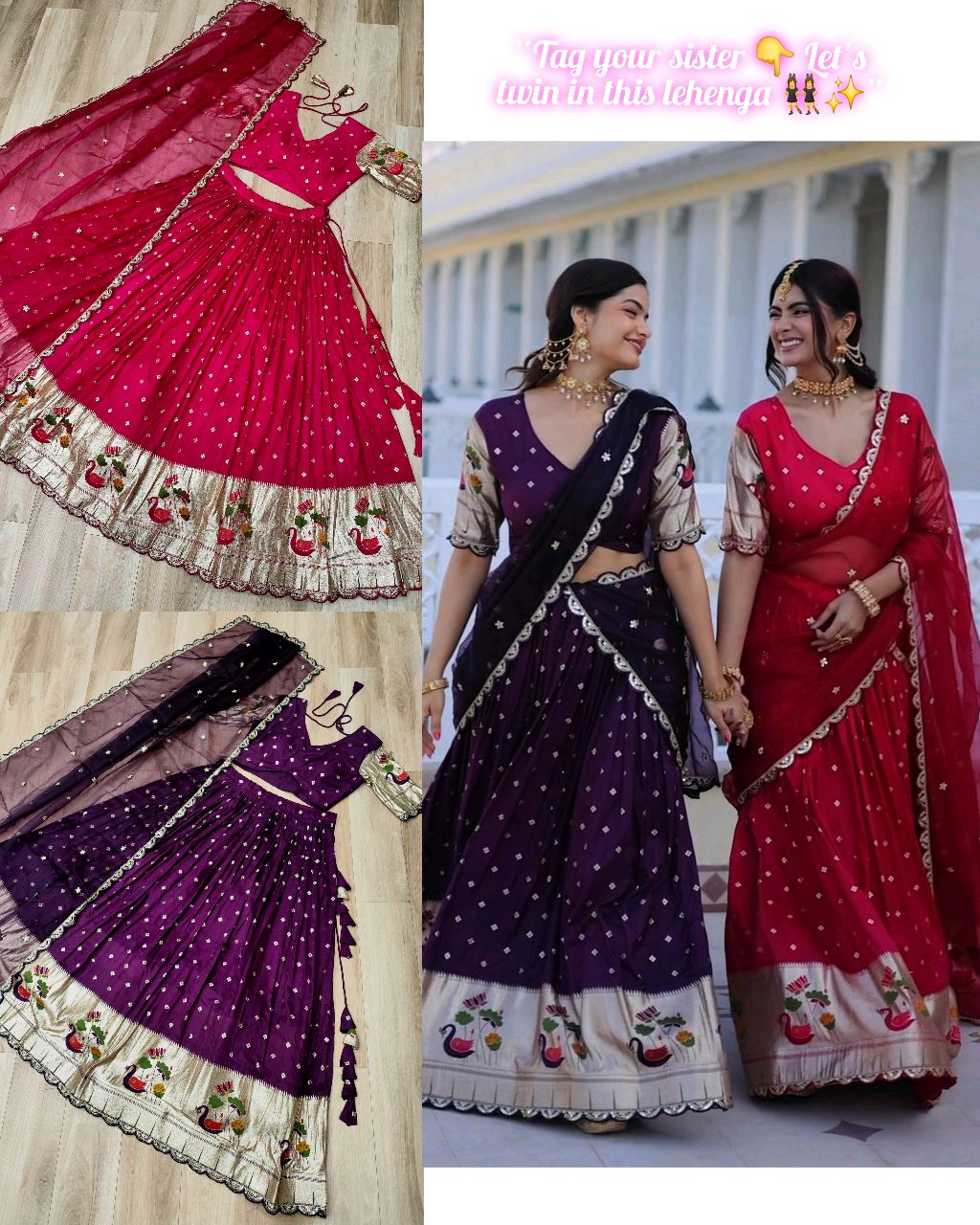 LEHENGALOVE 🔸Fabric: Dola silk with Meena Weaving With Sequins coding Embroidered lace Work. 🔸LENGTH* :- 42” 🔸WAIST* :- 42” 🔸INNER* :- Cotton 🔸FLAIR* :- 3 Mtr 🔸CLOSURE* :- Zip Attached & With Dori 🔸STITCHING* :- Standard Stitching with Canvas Patta 🔸BLOUSE* :- (Un-stitched)👇🏻 🔸FABRICS & WORK* :- Dola silk with Meena Weaving With Sequins coding […]