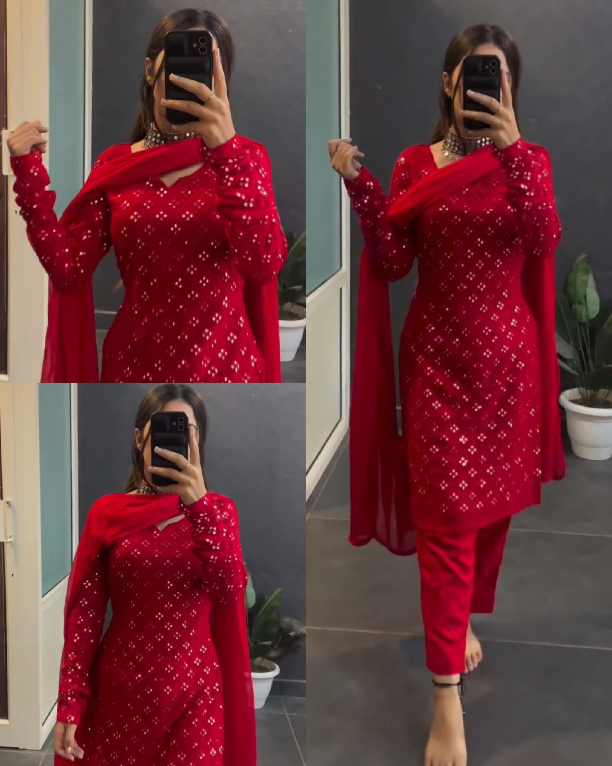 Sold out all size🚫 Looking Beautiful Designer Suit 🔸Fabric: Faux Georgette with inner 🔸Work :- 9MM Sequnce work with Thred 🔸Kurti , Pant , Dupatta Set 🔸SIZE : M(38) L(40) XL(42)