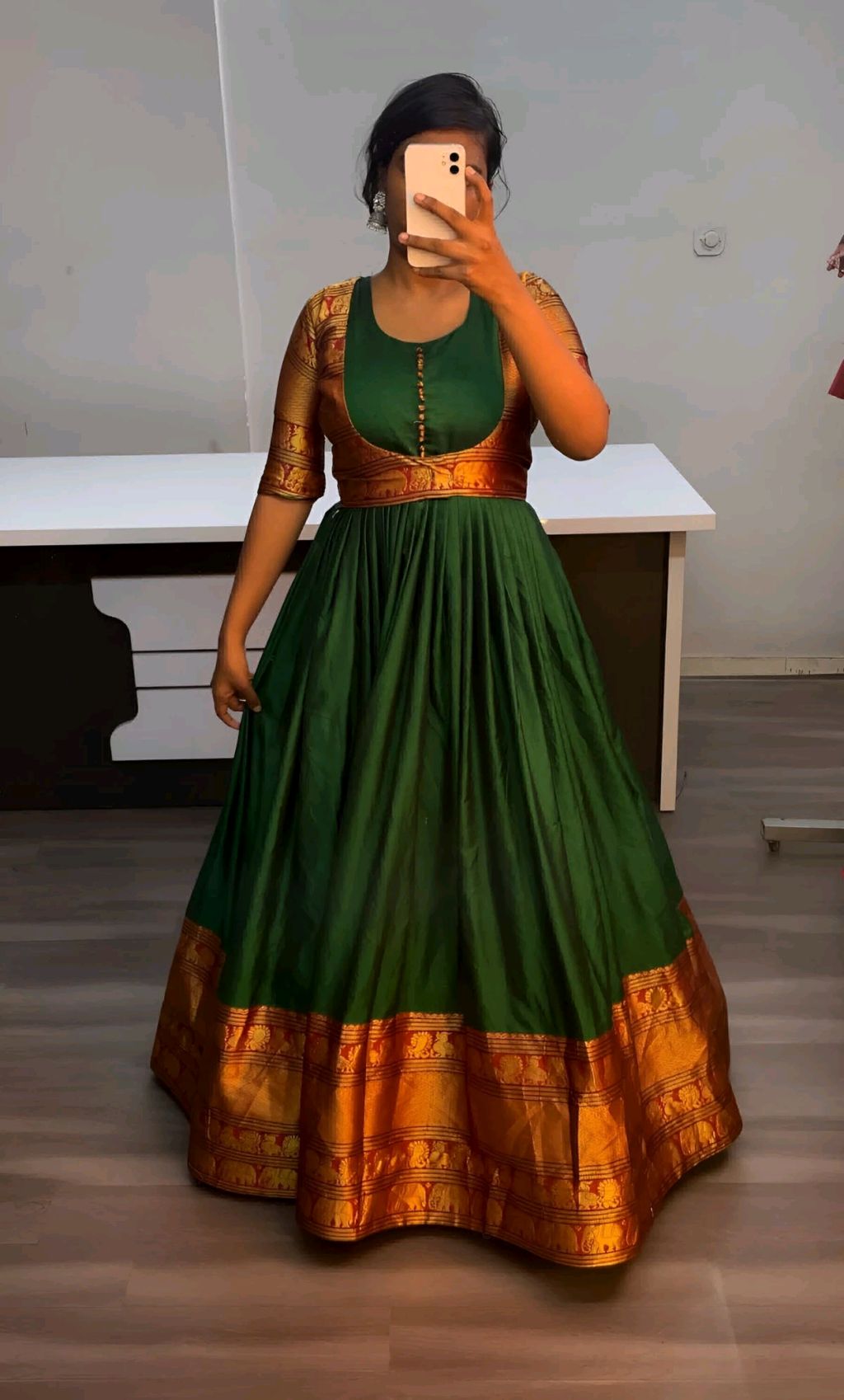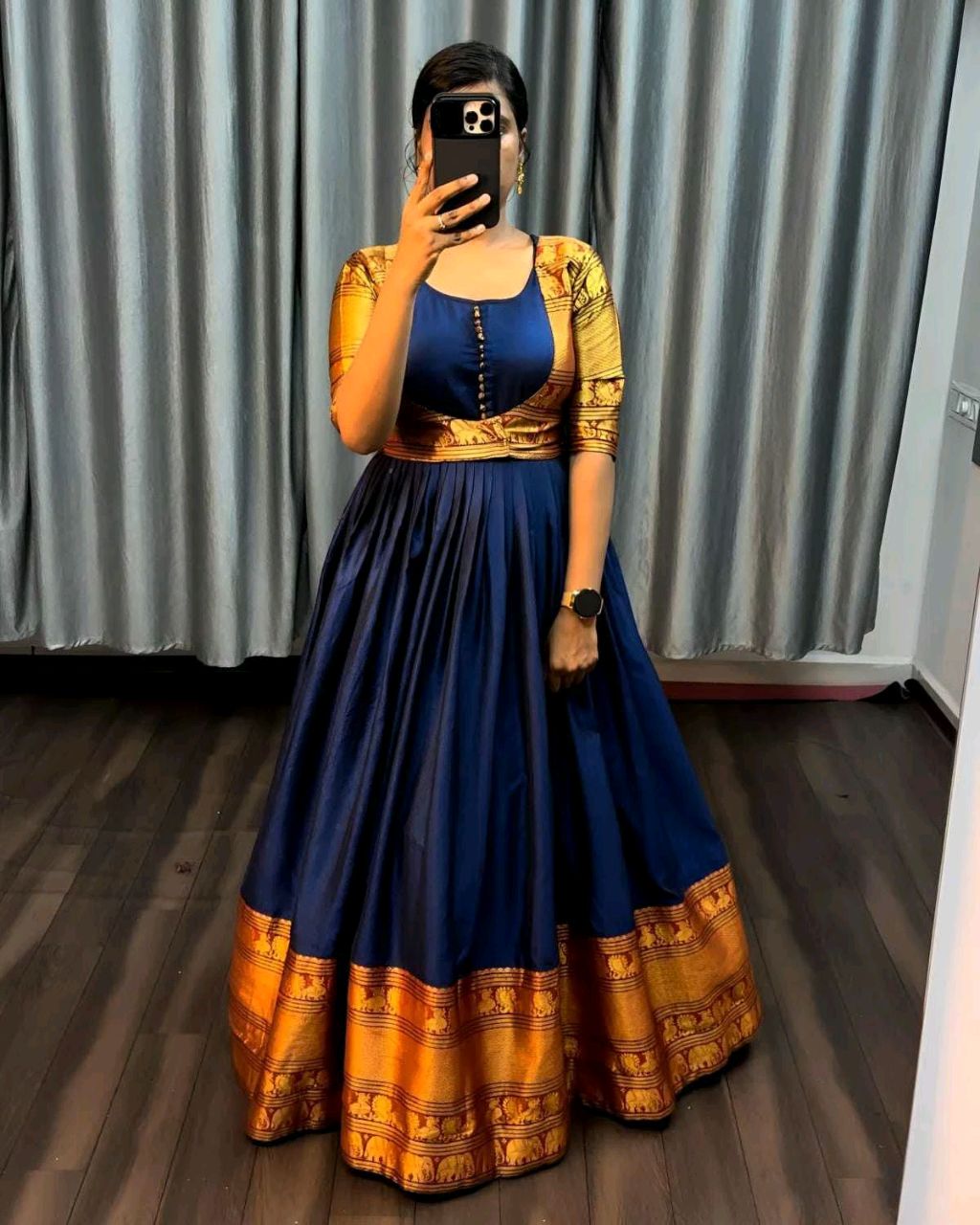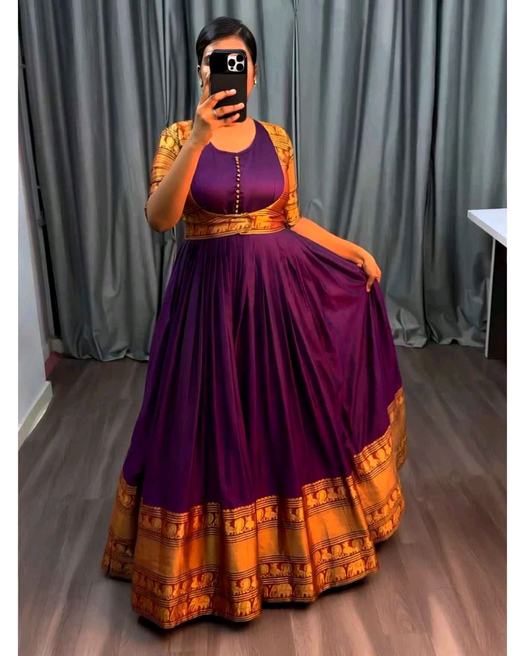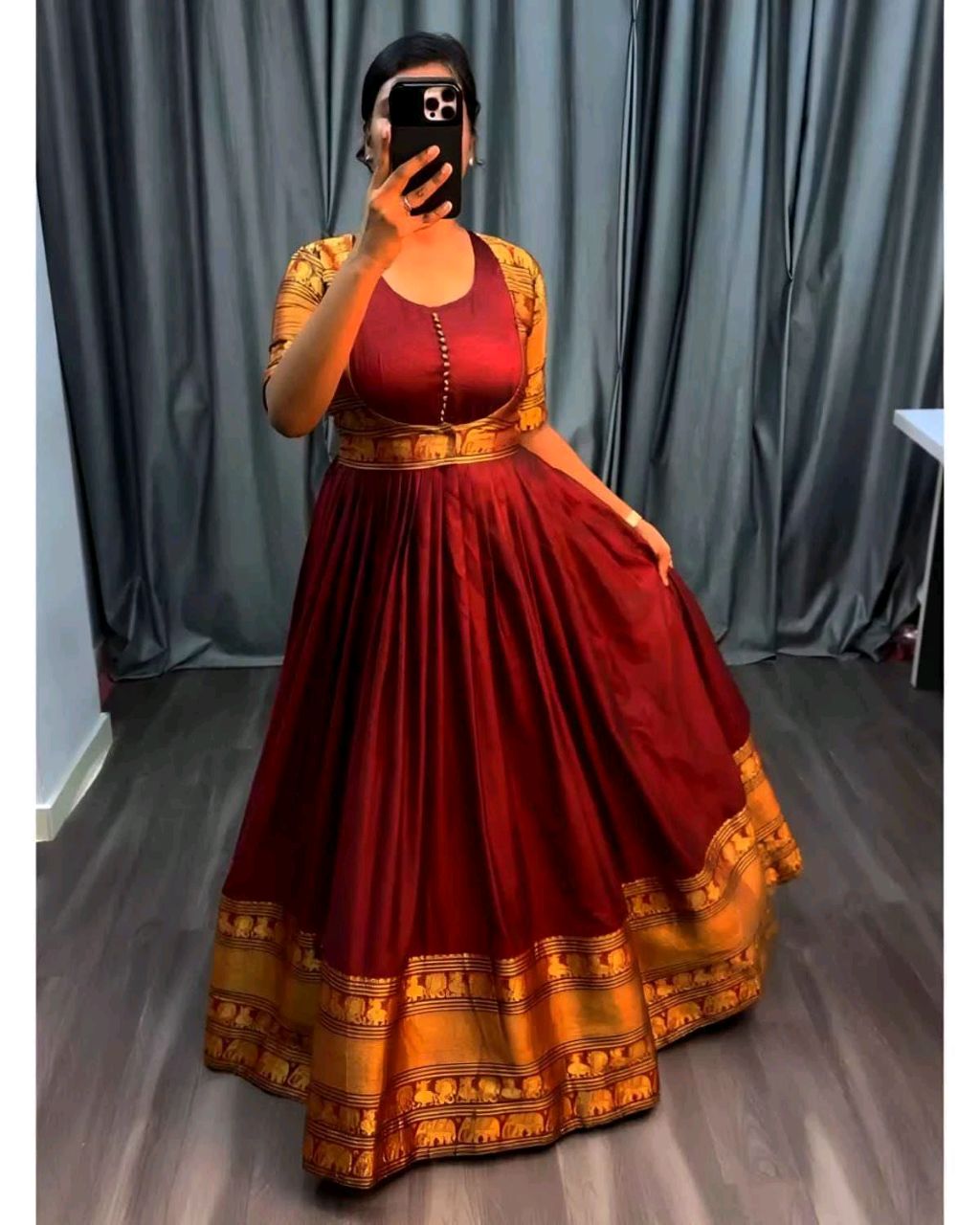Pure Narayanpet Gown with Removable coat 🔸Fabric : Pure Narayanpet 🔸SIZE : S(36) M(38) L(40) XL(42) XXL (44) 🔸Flare : 3 meter heavy flare 🔸Full crepe lining 🔸Length : 54-55 inches