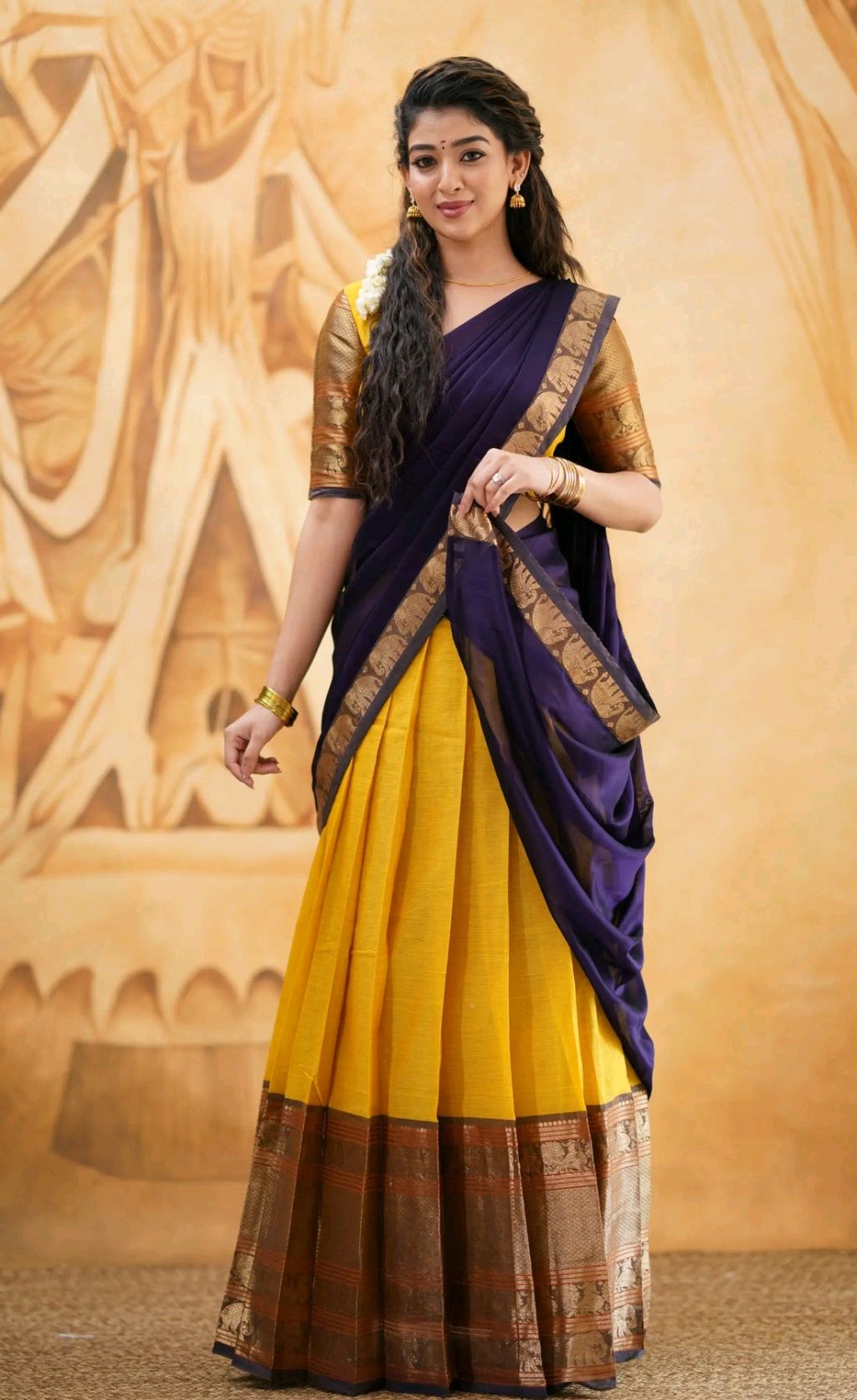 South Indian Traditional Half Saree 🔸Top wear Fabric: Art Silk 🔸Bottomwear Fabric: Art Silk 🔸Dupatta Fabric: Art Silk 🔸Set type: Lehenga Dhavani 🔸Top Print or Pattern Type: Zari 🔸Bottom Print or Pattern Type: Zari 🔸Dupatta Print or Pattern Type: Woven Design 🔸Sizes: Unstitched (Lehenga Waist Size: 70 in, Lehenga Length Size: 70 in, Duppatta Length […]