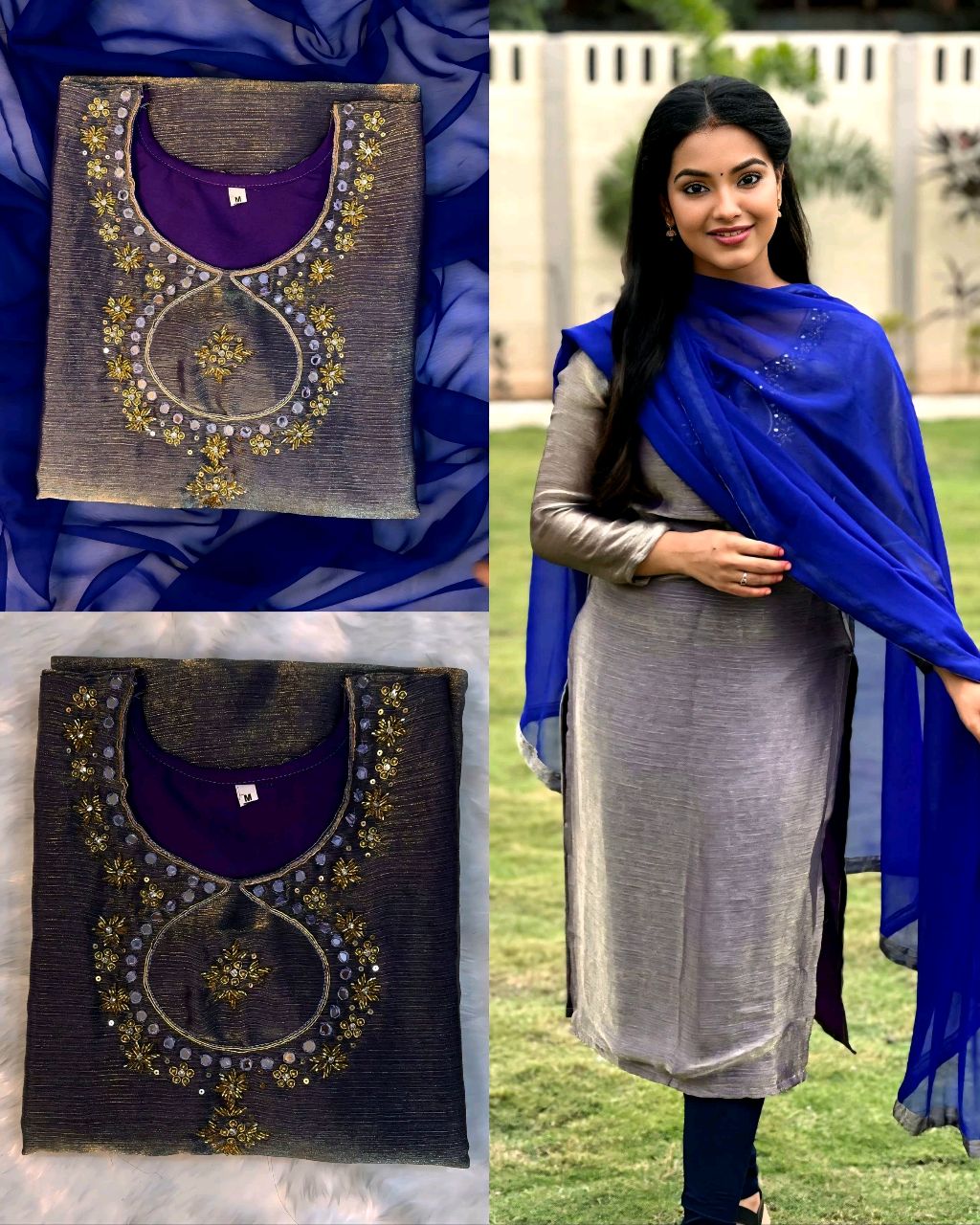 Space Silk with hand work 🔸Fabric: space silk with hand work 💫 🔸Dupatta : Fox georgette with all side space silk lace 🔸Complete Linning* 🔸Colours:- 4 🔸Length:- 43 Inchs 🔸BUST SIZE : S – 36, M – 38 in, L – 40 in, XL – 42, XXL – 44