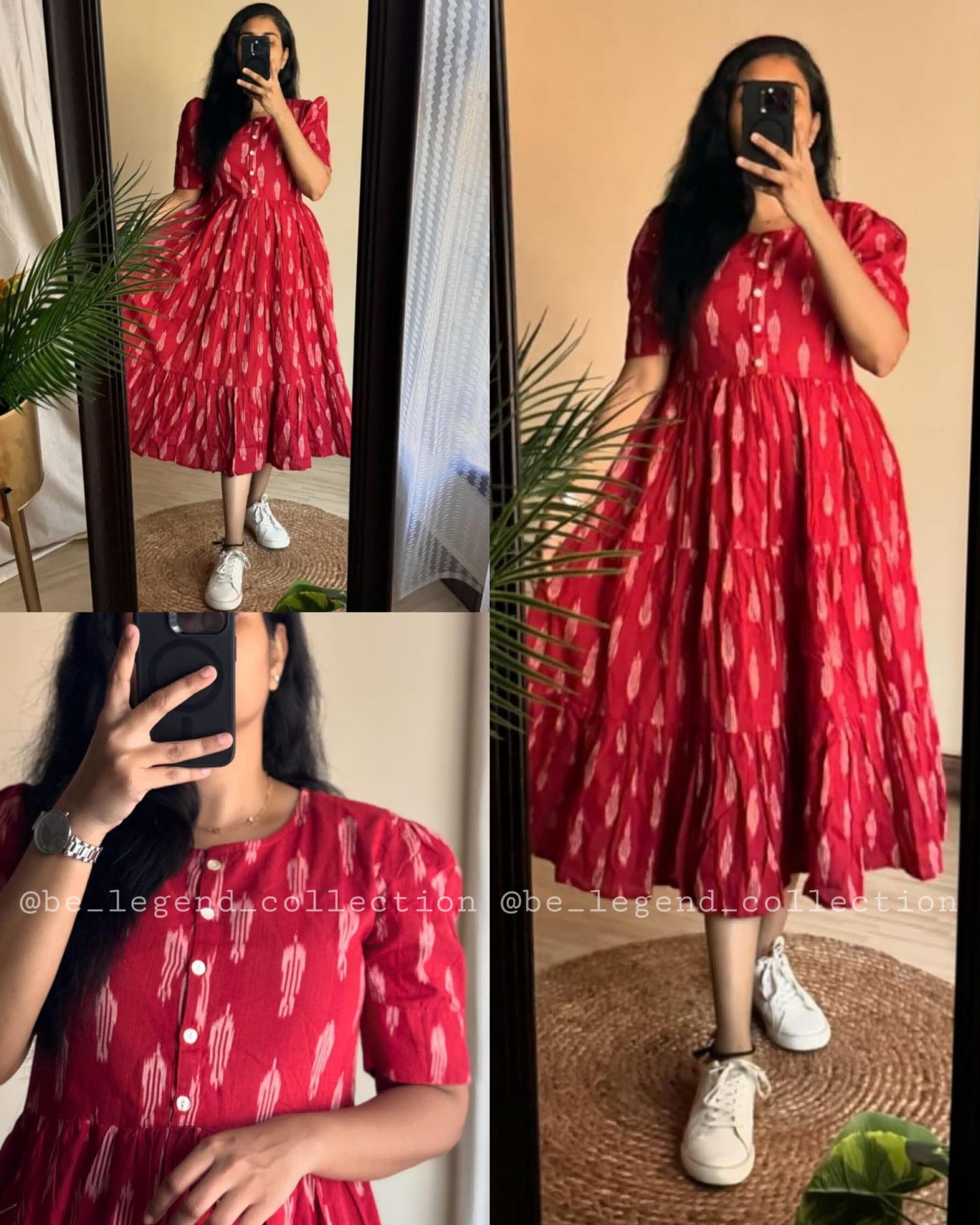 Summer Beautiful Full Flair Gown 🔸FABRIC :- Pure Cotton 60/60 🔸Length – 48+ 🔸Super Flair – 60 😍* 🔸Print- ikkat (Procin) 🔸SIZE : M(38) L(40) XL(42) XXL (44)