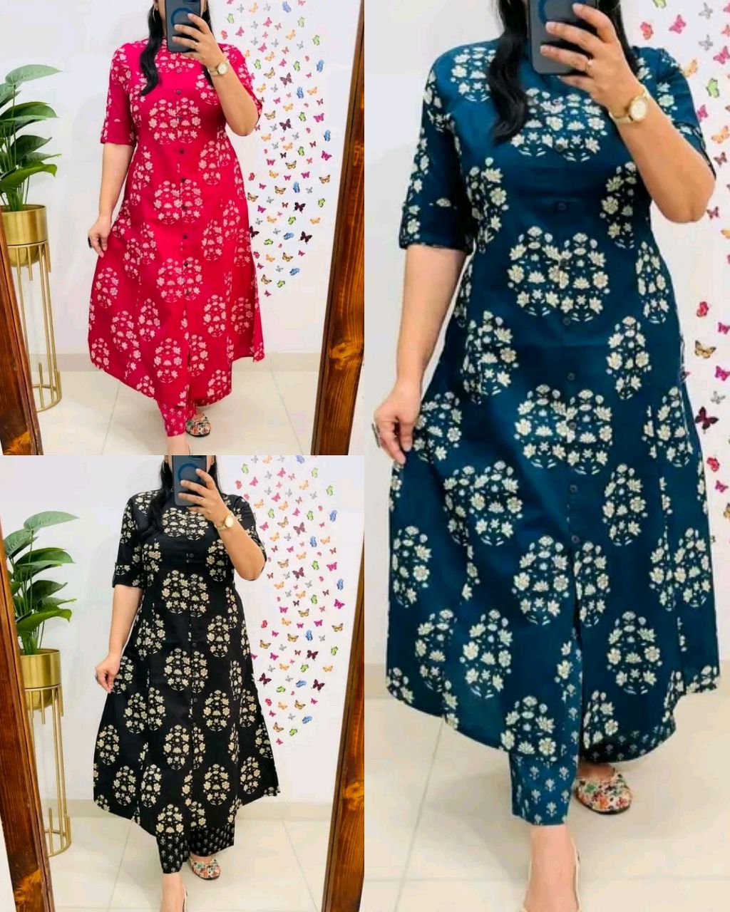 Trendy daily college & office wear Co-ord Set outfit relaxed & comfort fit 🔸 Fabric : Rayon cotton print 🔸Kurti Length : 42 + 🔸Pant length : 38 🔸Kurti & Pant 🔸BUST SIZE : M – 38 in, L – 40 in, XL – 42, XXL – 44, XXXL – 46