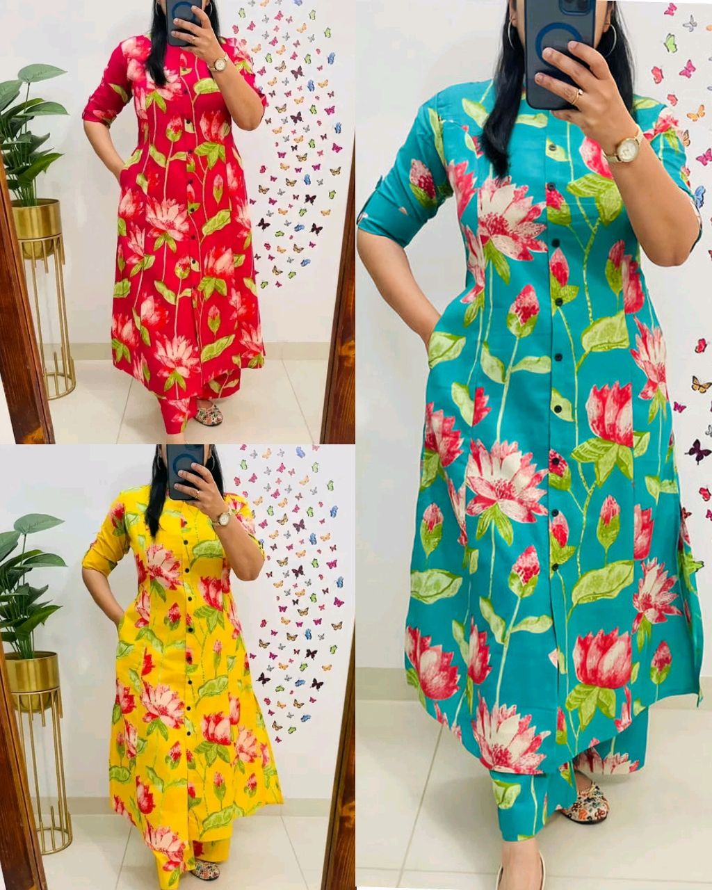 Trendy daily college & office wear Co-ord Set outfit relaxed & comfort fit 🔸 Fabric : Rayon cotton print 🔸Kurti Length : 42 + 🔸Pant length : 38 🔸Kurti & Pant 🔸BUST SIZE : M – 38 in, L – 40 in, XL – 42, XXL – 44, XXXL – 46