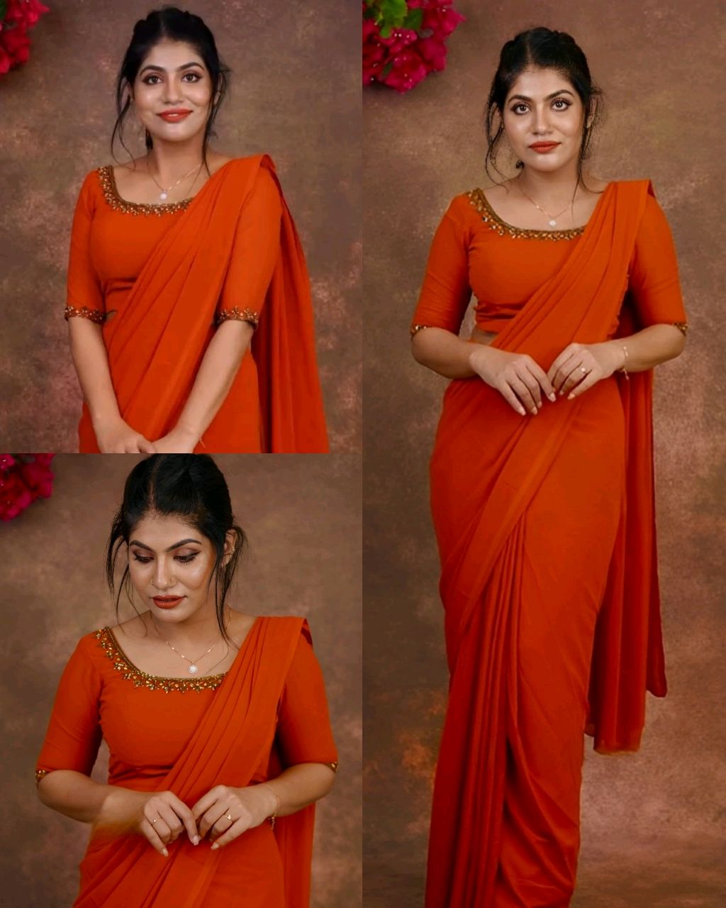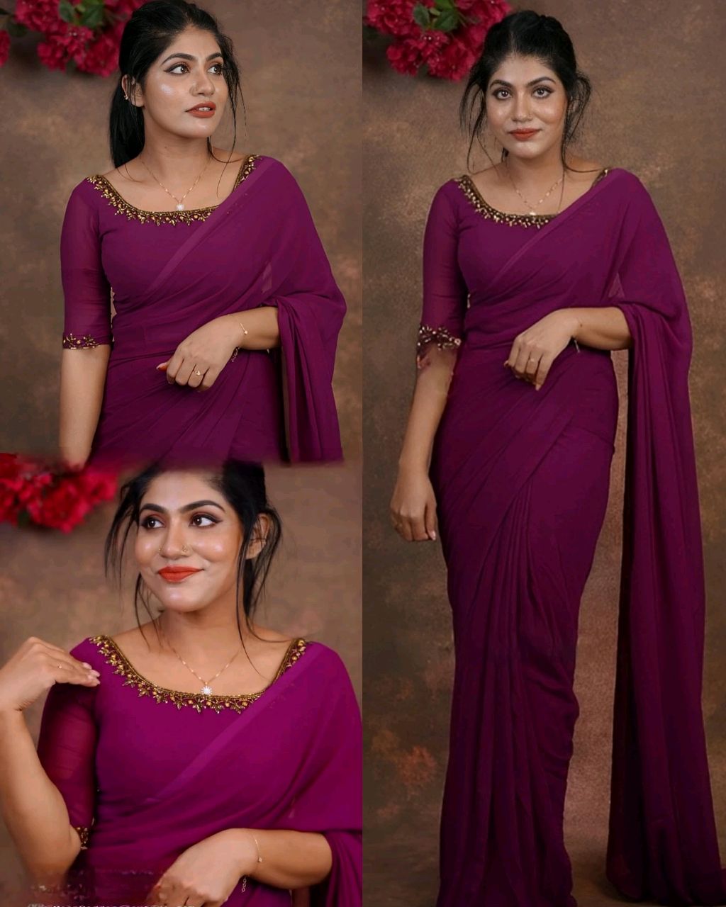 Trendy Elegance Saree with Elegance Handwork Stitched Blouse 🔸Fabric : Faux Georgette 🔸BLOUSE(Full Stitched)* 🔸Work : Handwork 🔸Size : Free Size (Up to 44)
