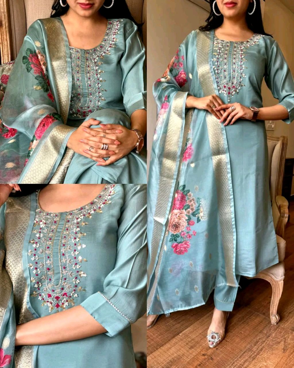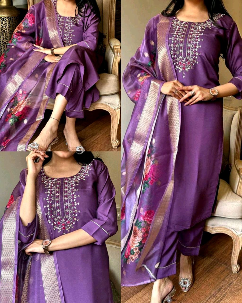 Trendy Embroidered Kurta With Printed Dupatta And pant