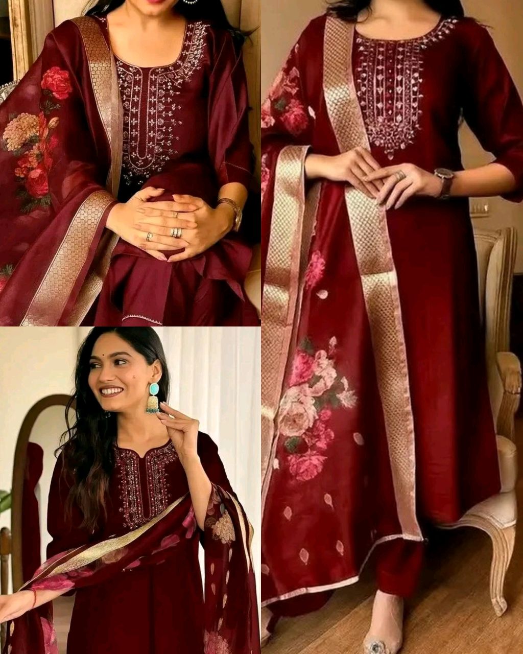 Trendy Embroidered Kurta With Printed Dupatta And pant 🔸Fabric: Rayon Slub 🔸Bottomwear Fabric: Rayon Slub 🔸Sleeve Length: Three-Quarter Sleeves 🔸Pattern: Solid 🔸Set Type: Kurta with Dupatta and Bottomwear 🔸Stitch Type: Stitched 🔸BUST SIZE : S – 36, M – 38 in, L – 40 in, XL – 42, XXL – 44
