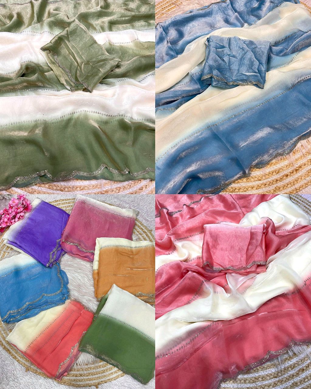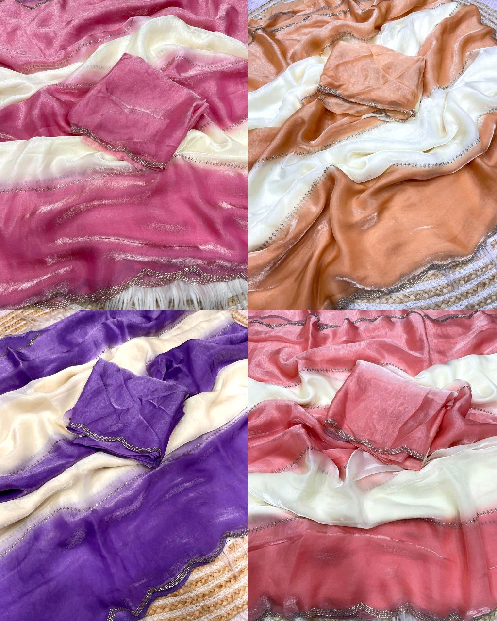 Trendy Premium quality party wear Saree 🔸Fabric: Fandy Sattin pending With Beautiful jarkhan Work 🔸Blouse – Fandy Sattin pending With jarkhan Work (Unstiched)* 🔸Saree Length – 5:50 mtr* 🔸Blouse Length – 0.80 mtr