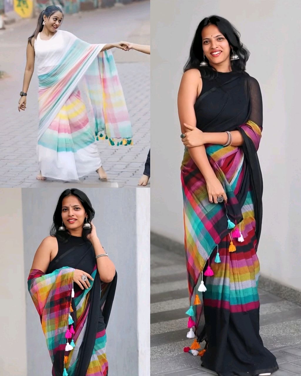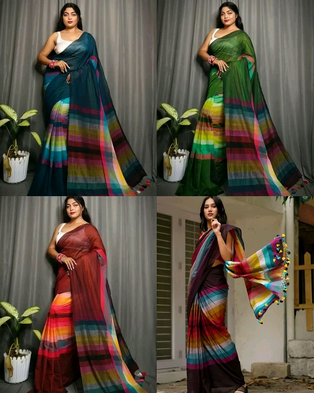 Trendy Rainbow Saree 🔸 Fabric : Cotton Blouse: Without Blouse 🔸Pattern: Striped 🔸Blouse Pattern: Solid 🔸Net Quantity (N): Single