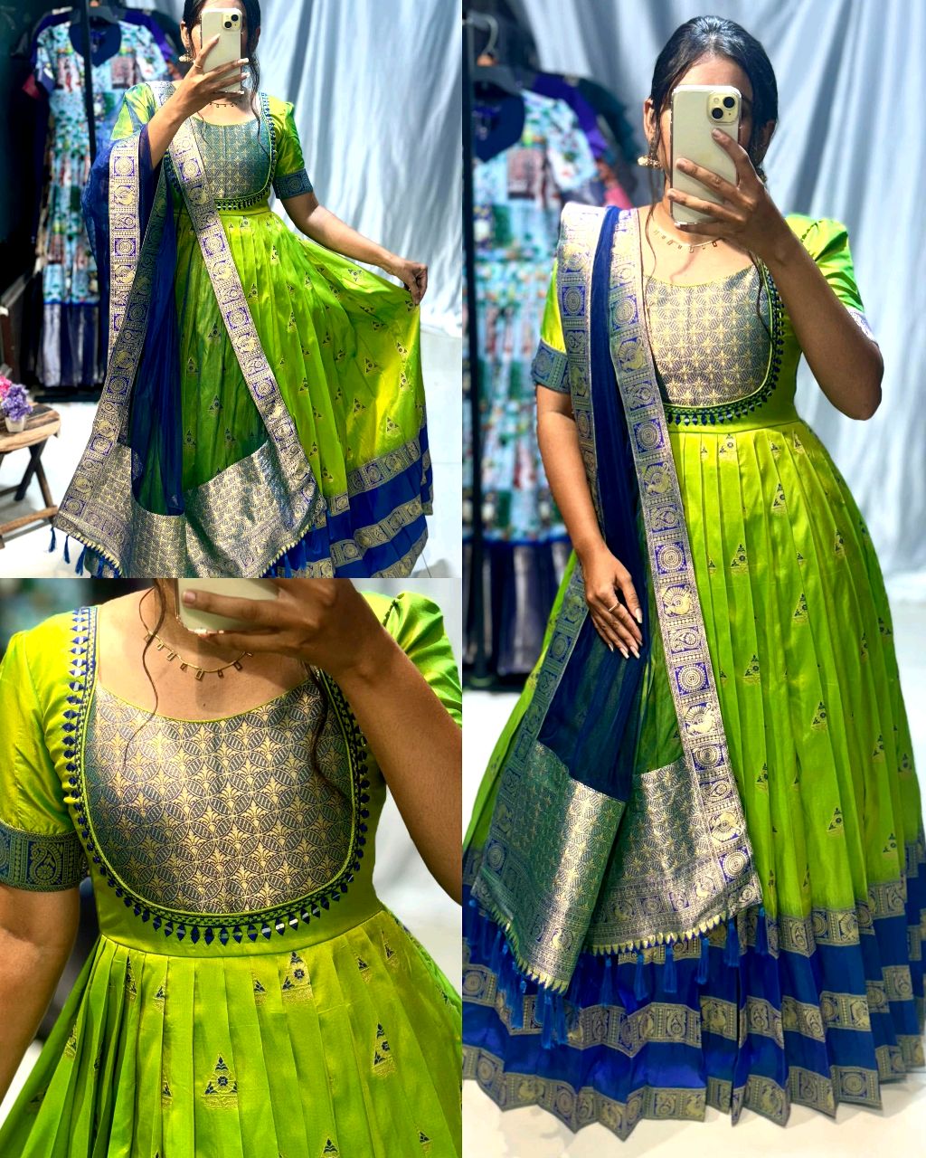 Trendy silk gown, crafted with banarasi silk and golden zari weave.paired with net duppta with zari border and decorated with mirror and work. 🔸Fabric: soft silk fabric with zari weave border 🔸Duppta-soft net with silk border 🔸Work-real mirror hand work 🔸Color- lime and blue 🔸Length-54’’ inch 🔸BUST SIZE : XS – 34, S – 36, […]