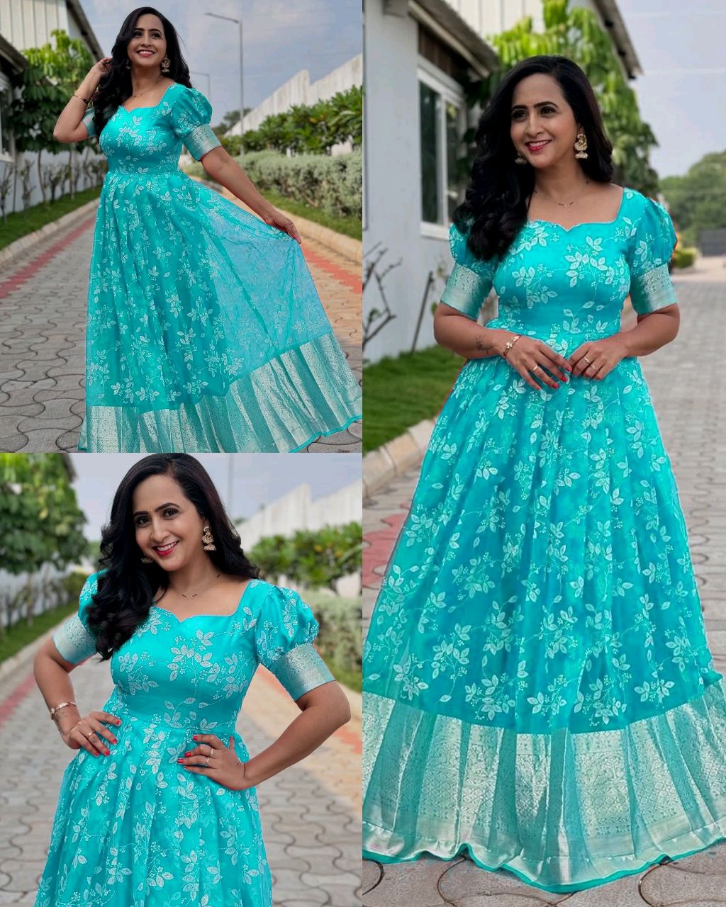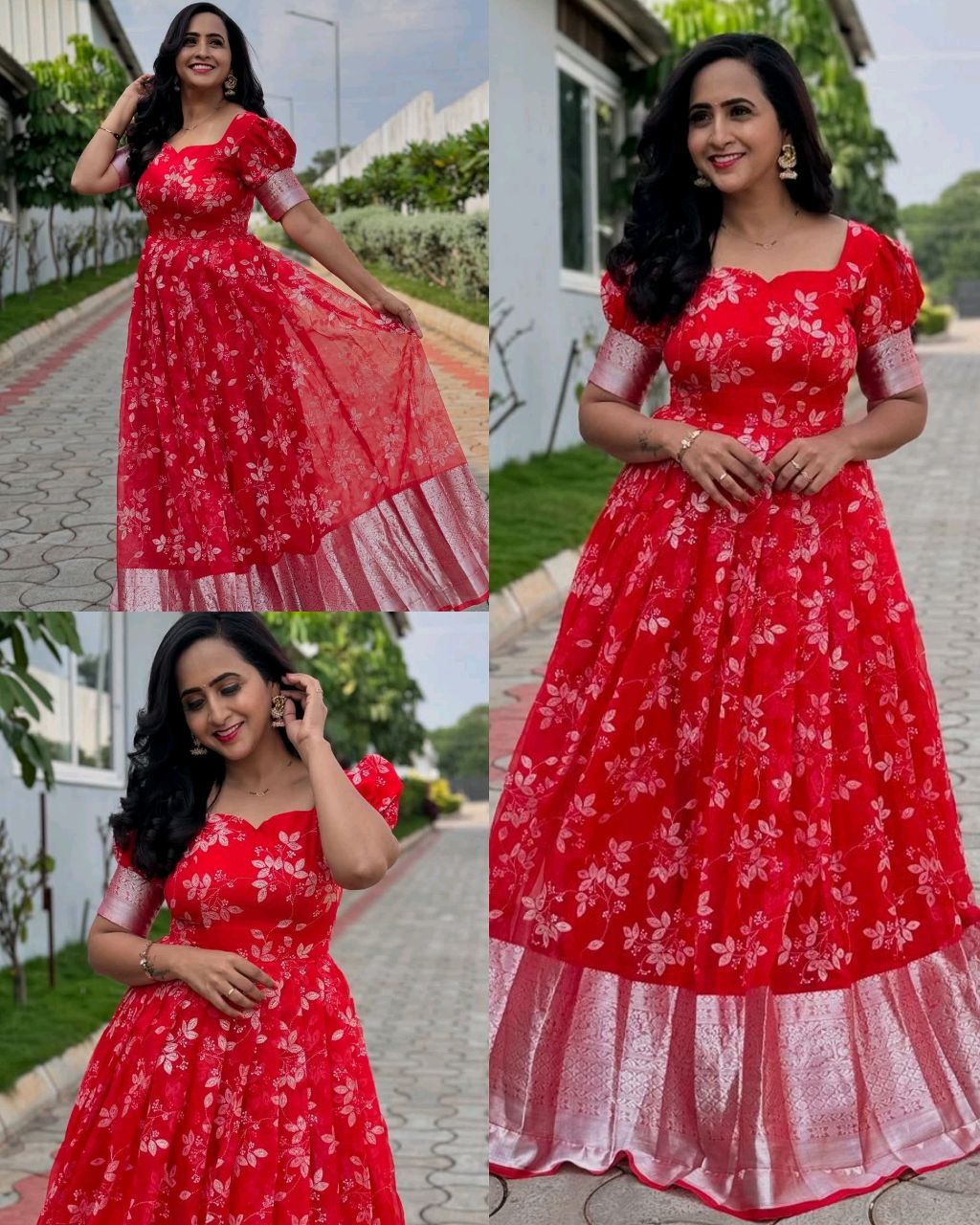 Sold out all size & colours🚫 Trendy Traditional Outfit Gown 🔸Fabric : Soft Organza 🔸Gown Work : Foil Work 🔸Length : 54″ 🔸Shoulder : 15 🔸Flair : 3.5 MTR 🔸Lining : Micro Cotton 🔸BUST SIZE : M – 38 in, L – 40 in, XL – 42, XXL – 44