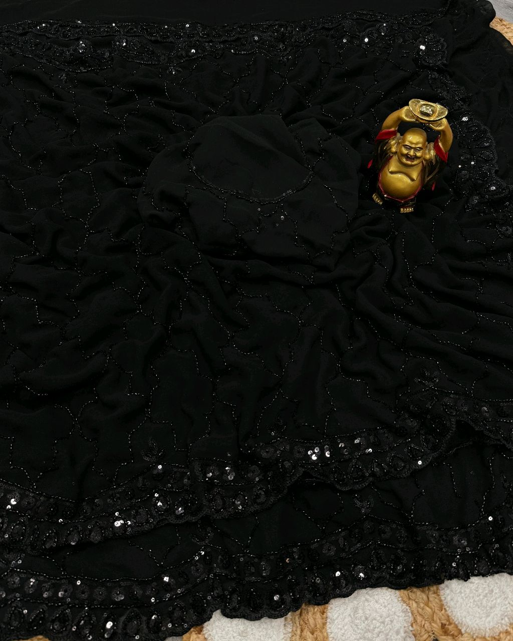 Viral Black beauty..Look classy, Feel Bossy🖤💣 🔸Fabric: On pure Georgette sarees in velvet shine adorned with sequence and cutdana delicate handwork* 🔸With work blouse piece