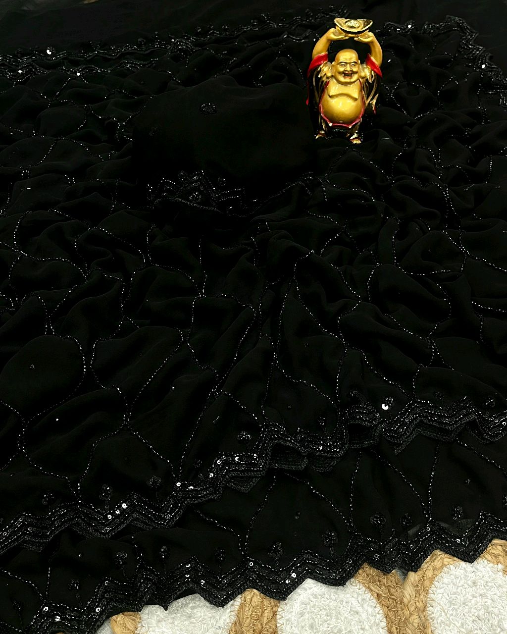 Viral Black beauty..Look classy, Feel Bossy 🔸FABRIC : On pure georgette sarees in velvet shine adorned with sequence and cutdana delicate handwork 🔸With work blouse piece