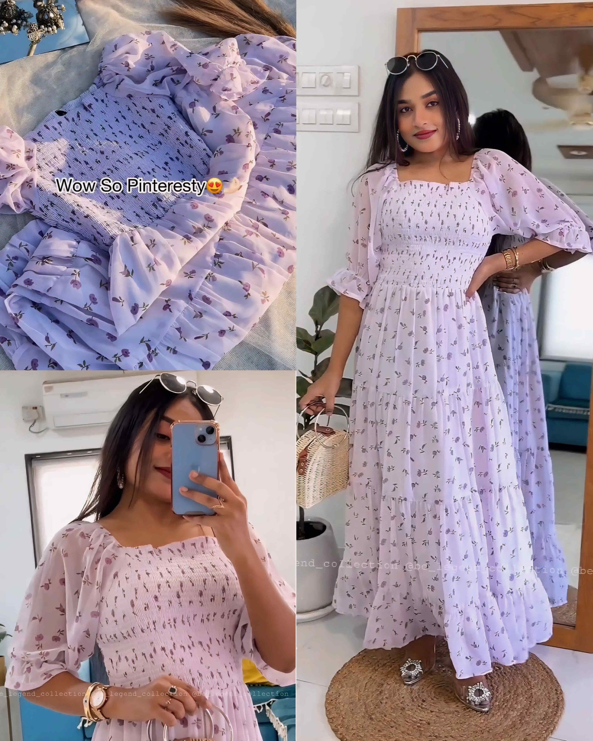White Floral Printed smocking and shirring Tiered Maxi Dress 🔸Fabric: Georgette 🔸Sleeve Length: Short Sleeves 🔸Pattern: Printed 🔸Net Quantity (N): 1 🔸SIZE : S(36) M(38) L(40) XL(42) XXL (44)