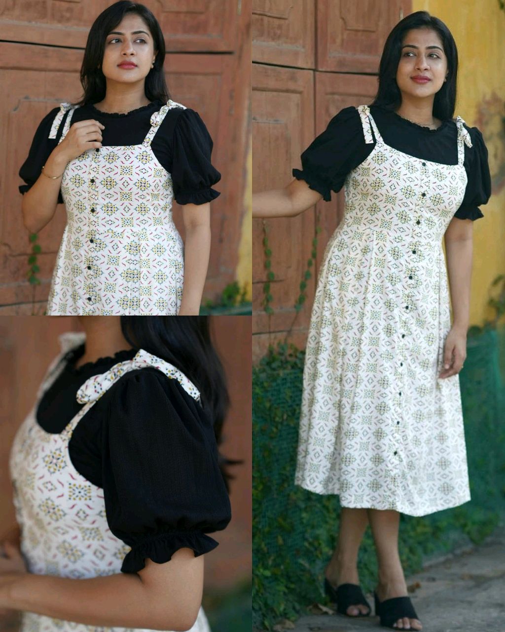 White Printed Button-Down Midi Dress with Black Puff-Sleeve Layer 🔸Fabric: Viscose Rayon 🔸Sleeve Length: Short Sleeves 🔸Pattern: Printed 🔸SIZE : S(36) M(38) L(40) XL(42) XXL (44) 3XL (46) 4XL (48) 5XL (50)