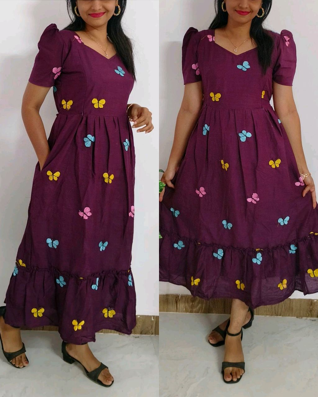 Wine Butterfly Embroidery 🔸Fabric: premium pure cotton complete embroidery 🔸Stitched with cotton lining top to bottom 🔸 Two SIDE INVISIBLE ZIP 🔸Length 48″ 🔸BUST SIZE : XS – 34, S – 36, M – 38 in, L – 40 in, XL – 42, XXL – 44