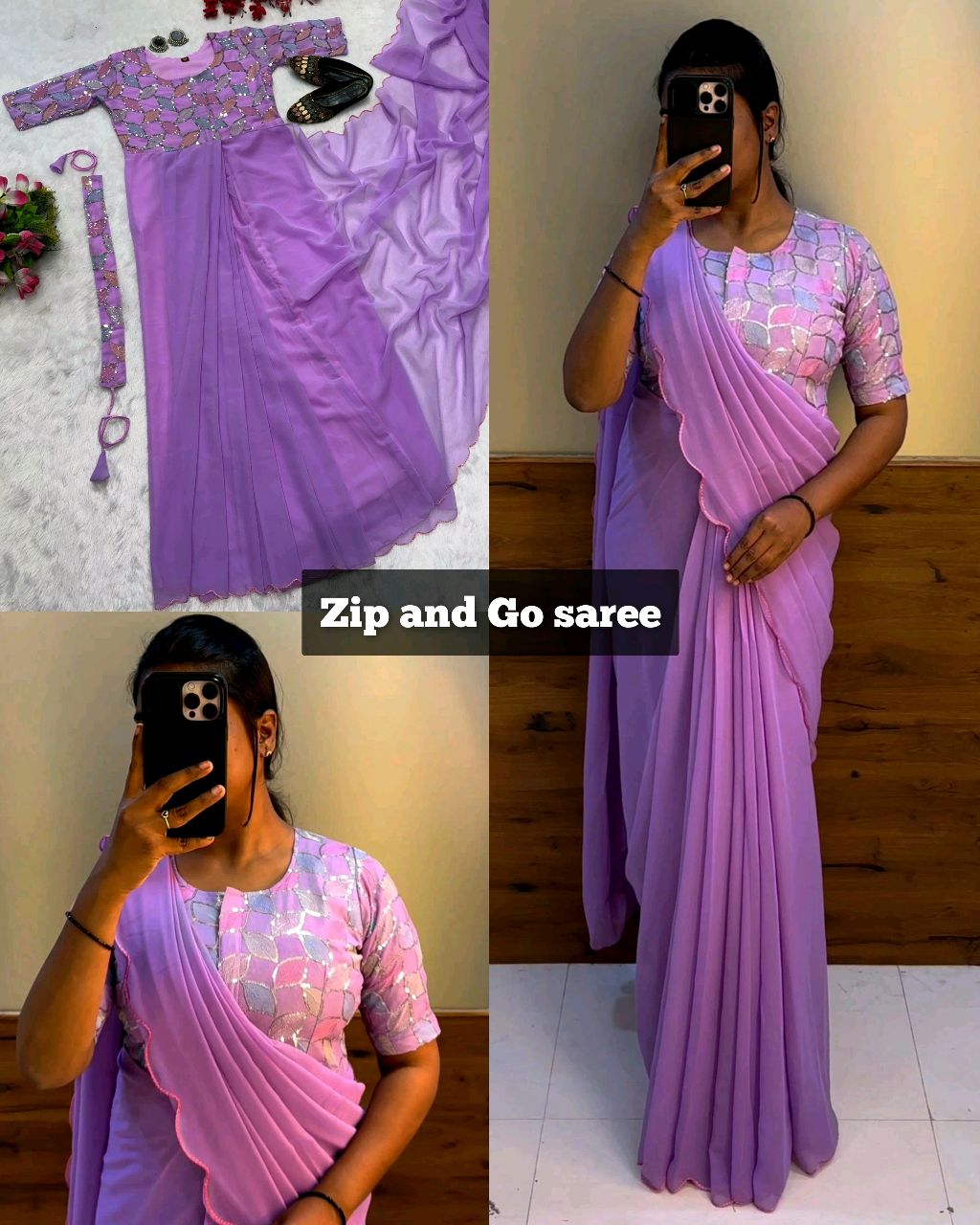 Zip and Go saree 🔸Fabric: Faux Gorgette 🔸Work:Embroidery 4 Sequence 🔸Work&Border Aarka Work 🔸Length:55-57 🔸Duppata Length:2.5 MTR 🔸BUST SIZE : XS – 34, S – 36, M – 38 in, L – 40 in, XL – 42, XXL – 44, XXXL – 46
